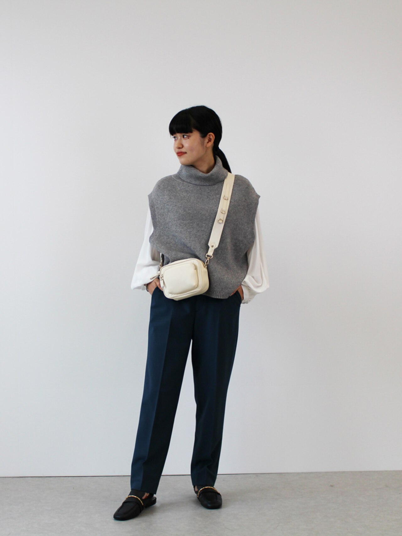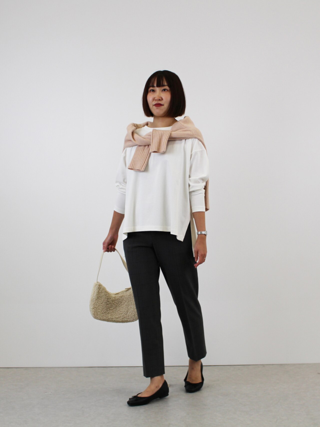 ママの1日は、超多忙。通勤、お出かけ、自転車での送迎、公園遊び。どんなシーンにも品の良さを印象づけるパンツ。