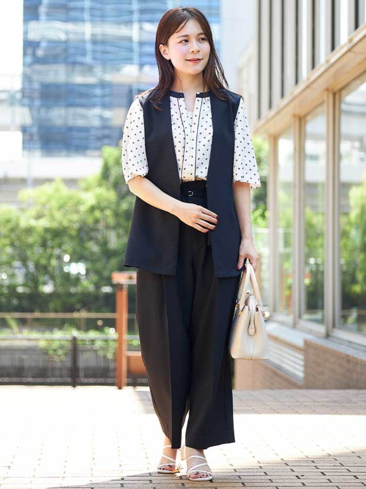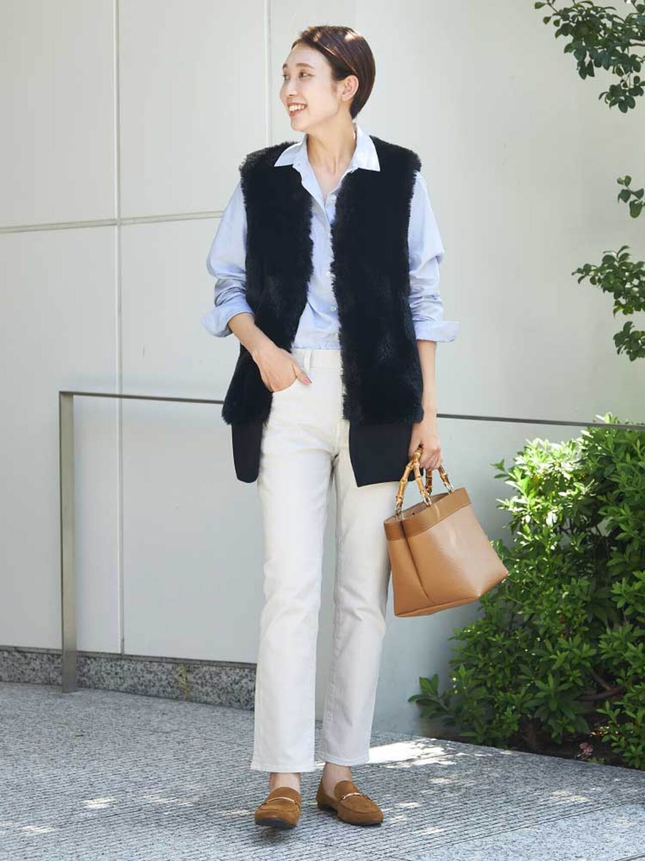 時にも、ショートジレが相性抜群。上半身に目線が行くのでスタイルアップも叶う!