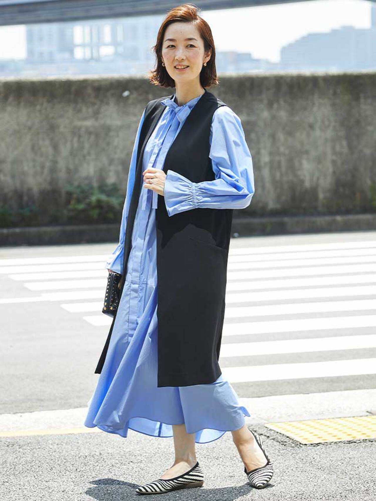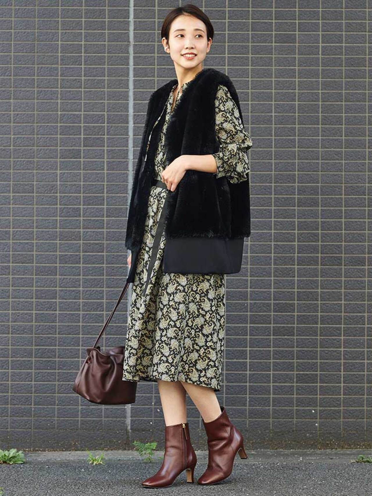 フェミニンなひざ下ワンピースには、この秋注目のショートジレが好バランス。甘めなコーディネートでもシックにまとまるので、印象を変えにくい
