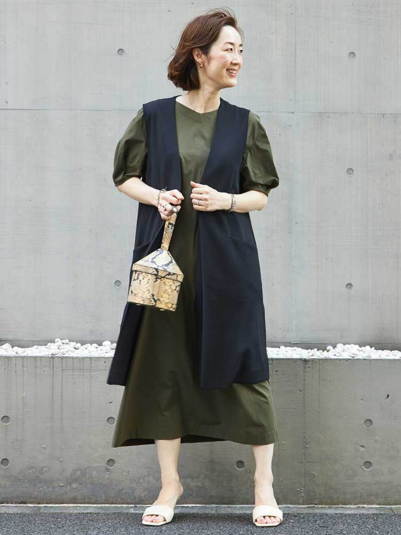 身頃がゆったりなワンピースも、ジレを羽織る