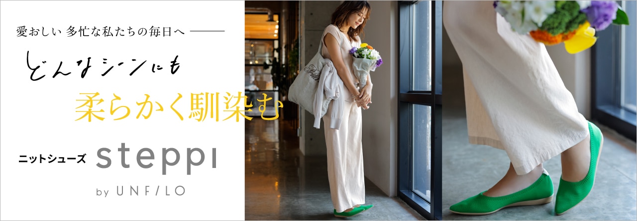 ONWARD CROSSET MAGのコーディネート組で初めて見た日に「コレ欲しい!」と一目惚れした「steppi」。とにかく軽くて柔らかい履き心地、夏でも蒸れにくい素材感で愛用しています。雑誌の編集部に打ち合わせなどで行くと、いろんな方に「何それ?」と聞かれて、履いてみたいとみんなに言われます。私は外反母趾気味なのですが、そこを優しく包んでくれるから、撮影やリースで立ちっぱなしの日もついつい選んでしまいますね!