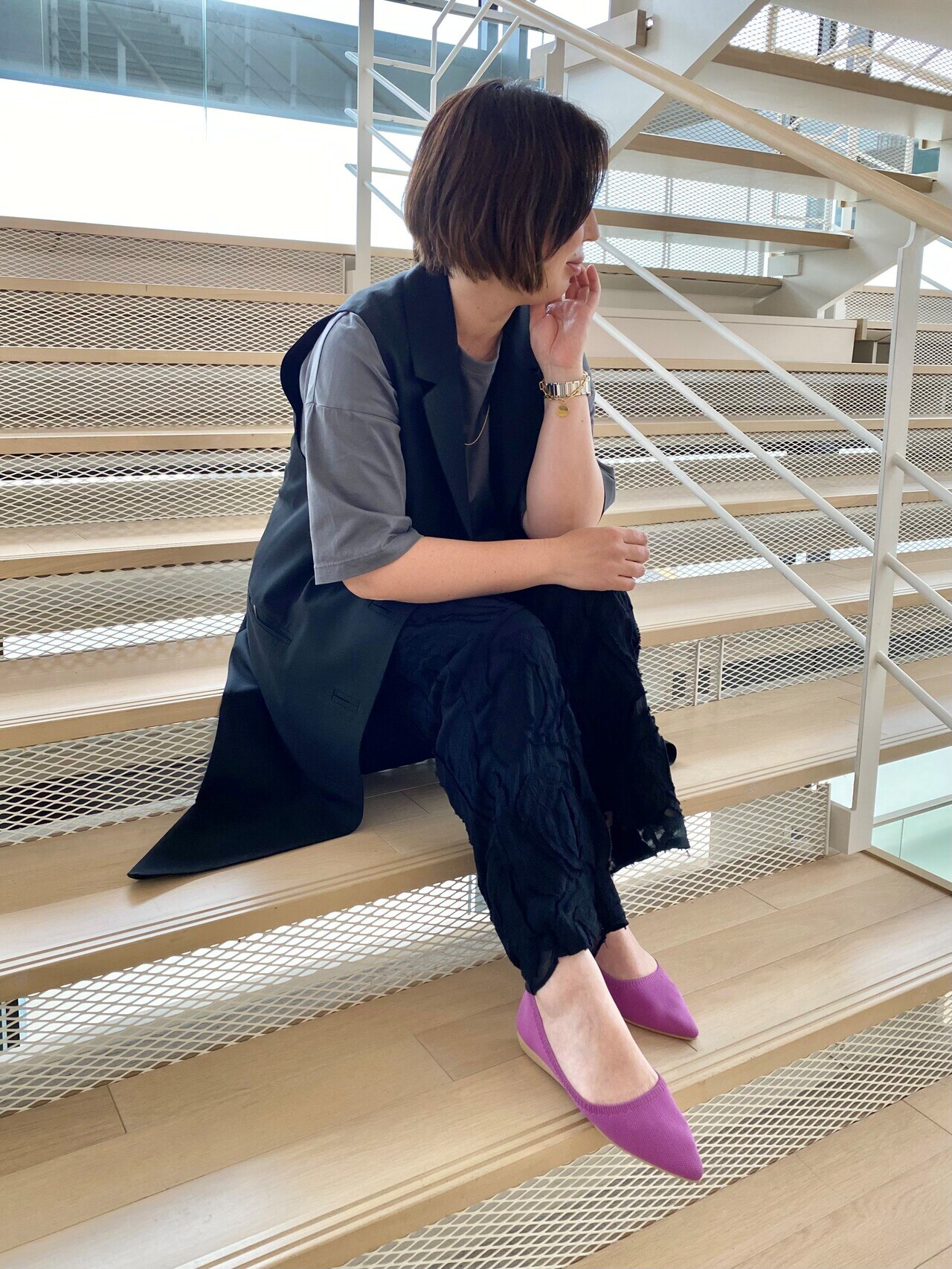 モノトーンコーデをパッと鮮やかに感じさせるパープルの力。ニットなので色映りも柔らかく色物も取り入れやすい!黒だったら冠婚葬祭シーンにも使えそうだし、もう一足欲しいなって思ってます。