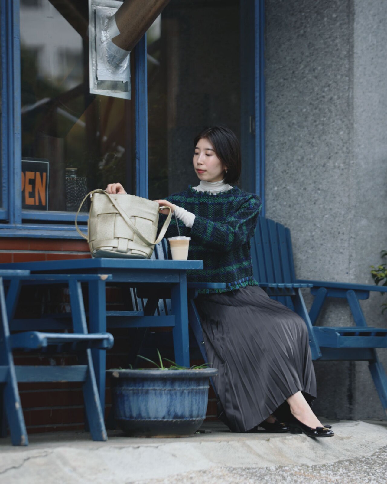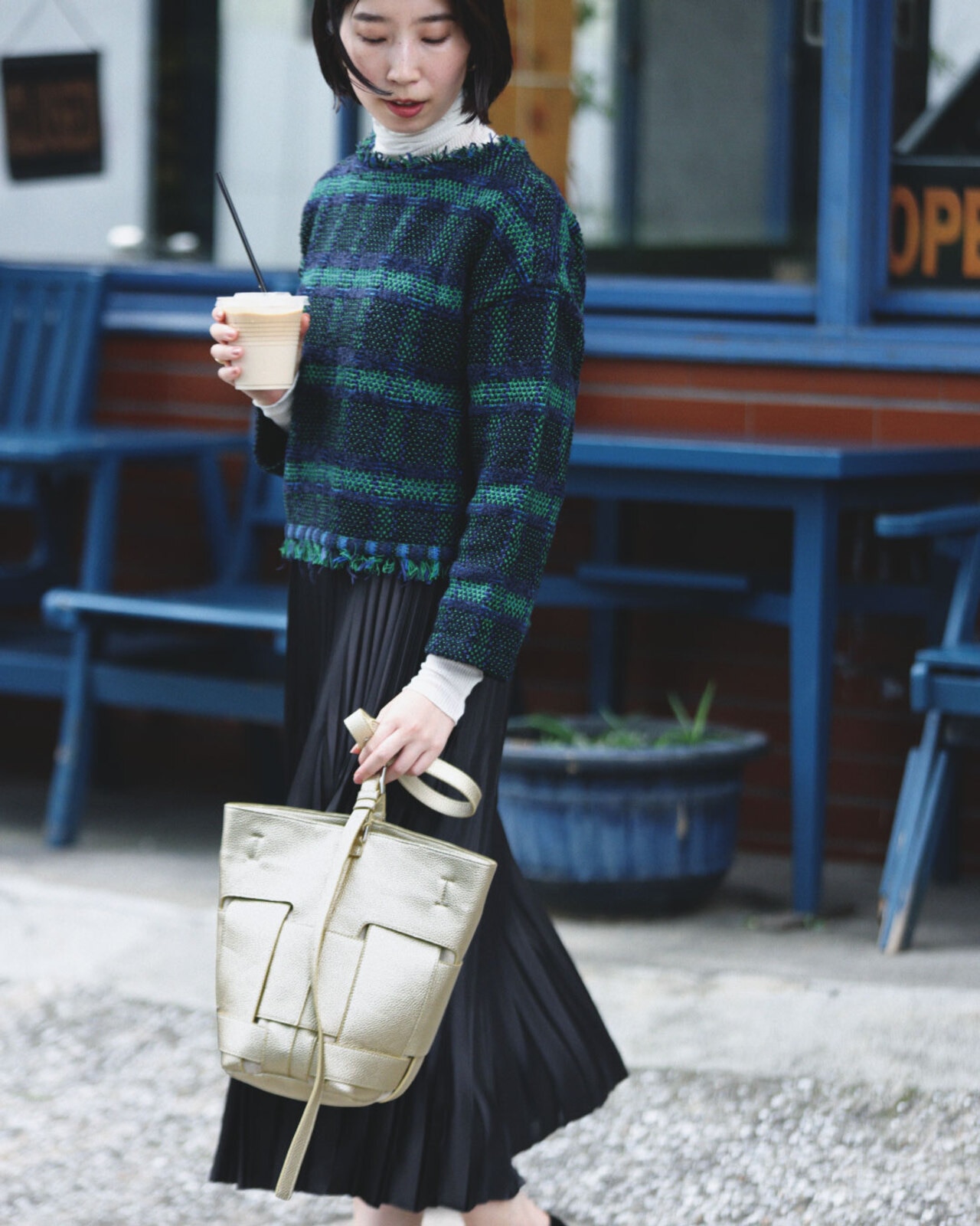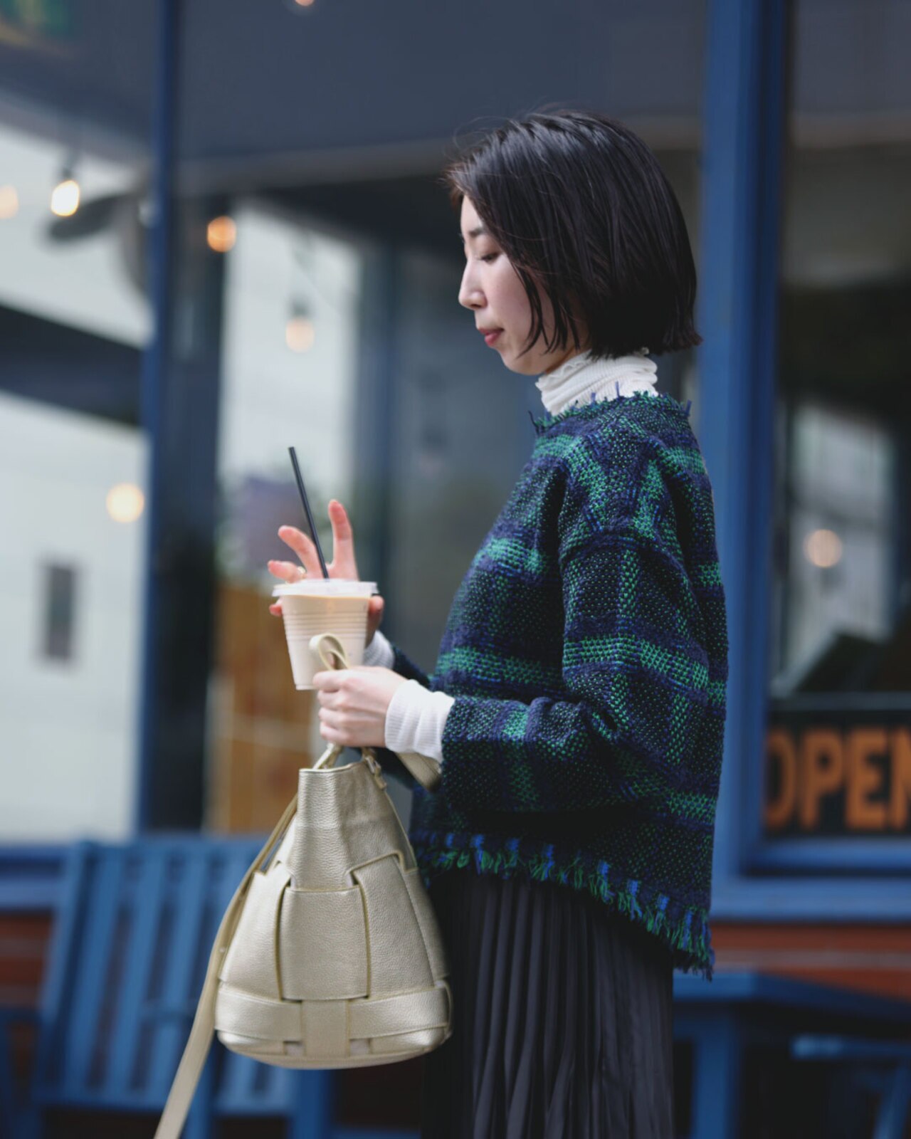 バッグを畳む方向を変えれば、ワンハンドルショルダーに変化。柔らかいエコレザーだから、今日の自分の気持ちに合わせて自在に持てるのはこのバッグの良さ。ゴールドのバッグは思いのほか主張せず馴染んで使いやすいから、華やかツイードブラウスにも好相性。