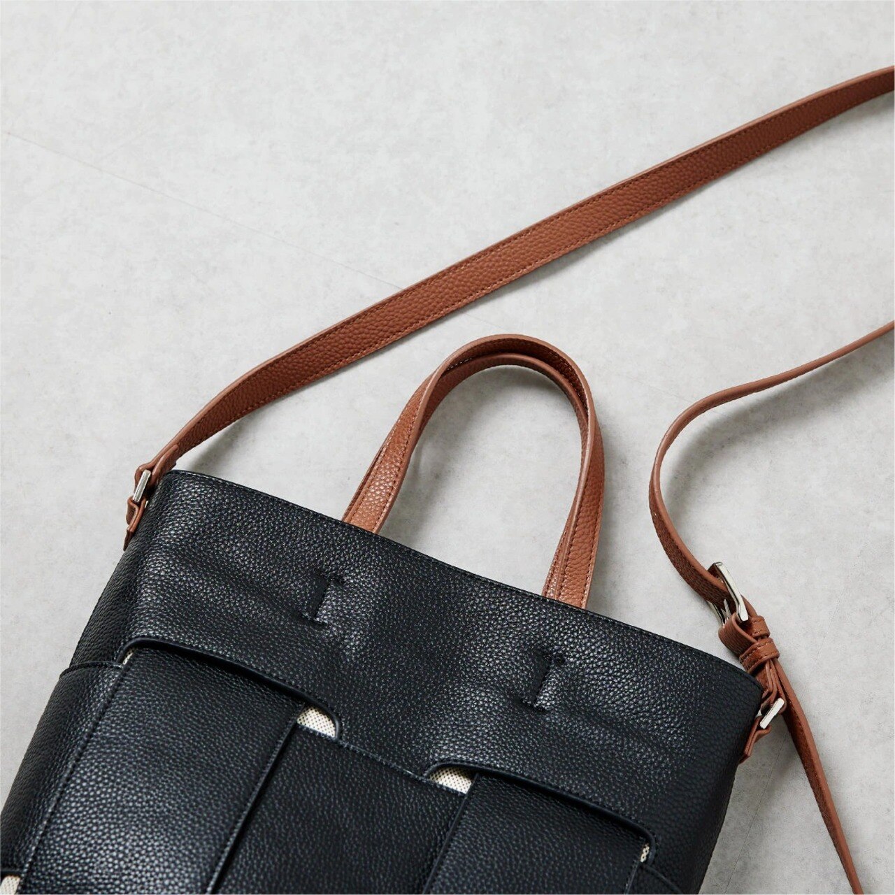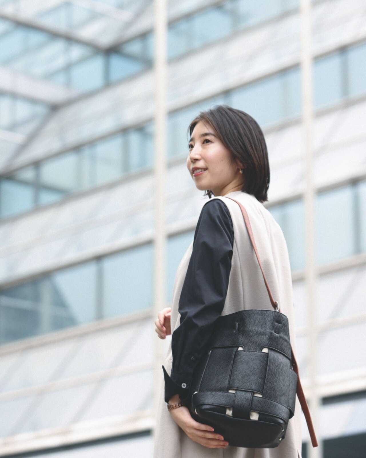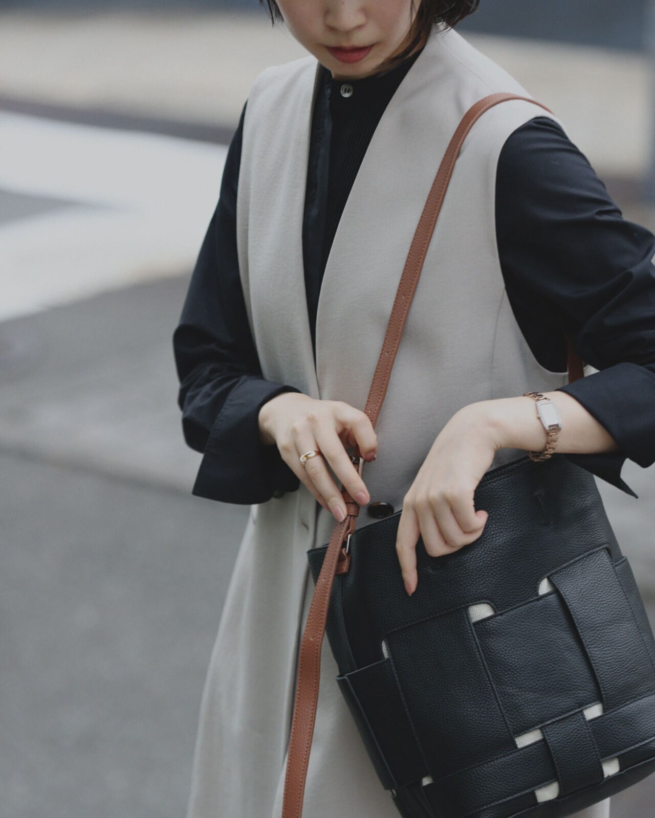 お仕事シーンで欠かせない黒バッグは、その信頼感と裏腹におカタく見えることも。編み上げたエコレザーの隙間があることで軽さがON。ブラウンのベルトもコーディネートの色を馴染ませてくれるポイント!マチのしっかりしたサイズ感でお弁当箱もタブレットもすっぽり。