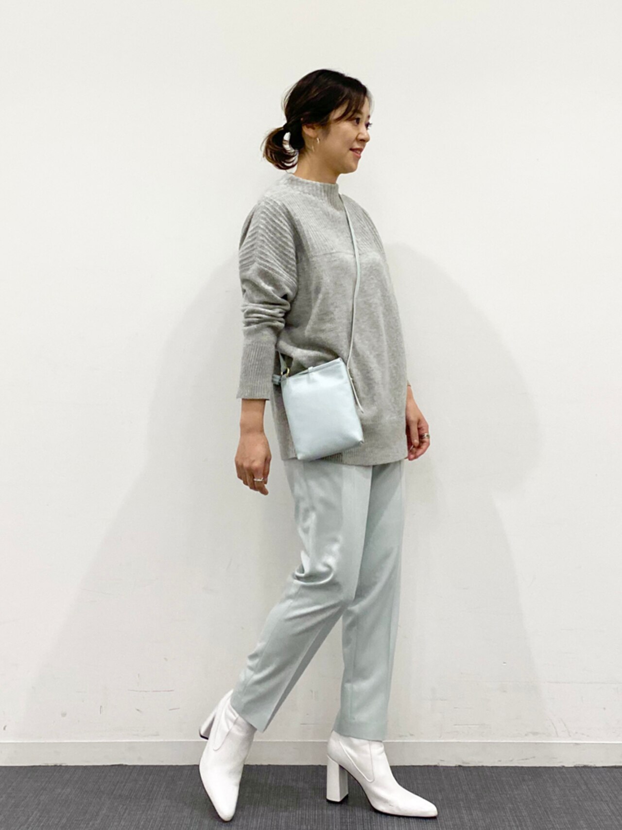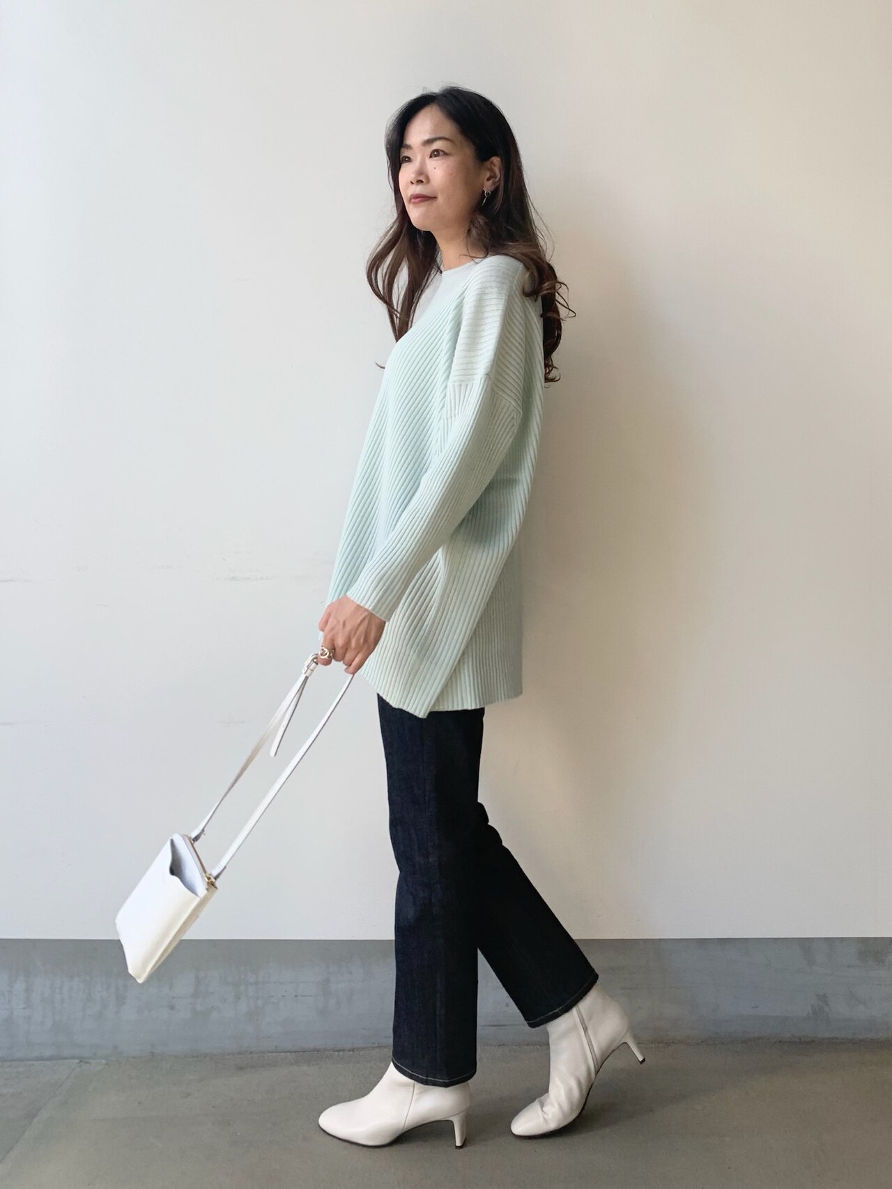 美シルエットのスティックパンツに、優しい風合いのカシミヤ混ニットを合わせて、抜け感のあるきれいめカジュアルな着こなしに。全体を白からミントのクリアな配色で揃えているので、定番アイテムも新鮮に見えます。