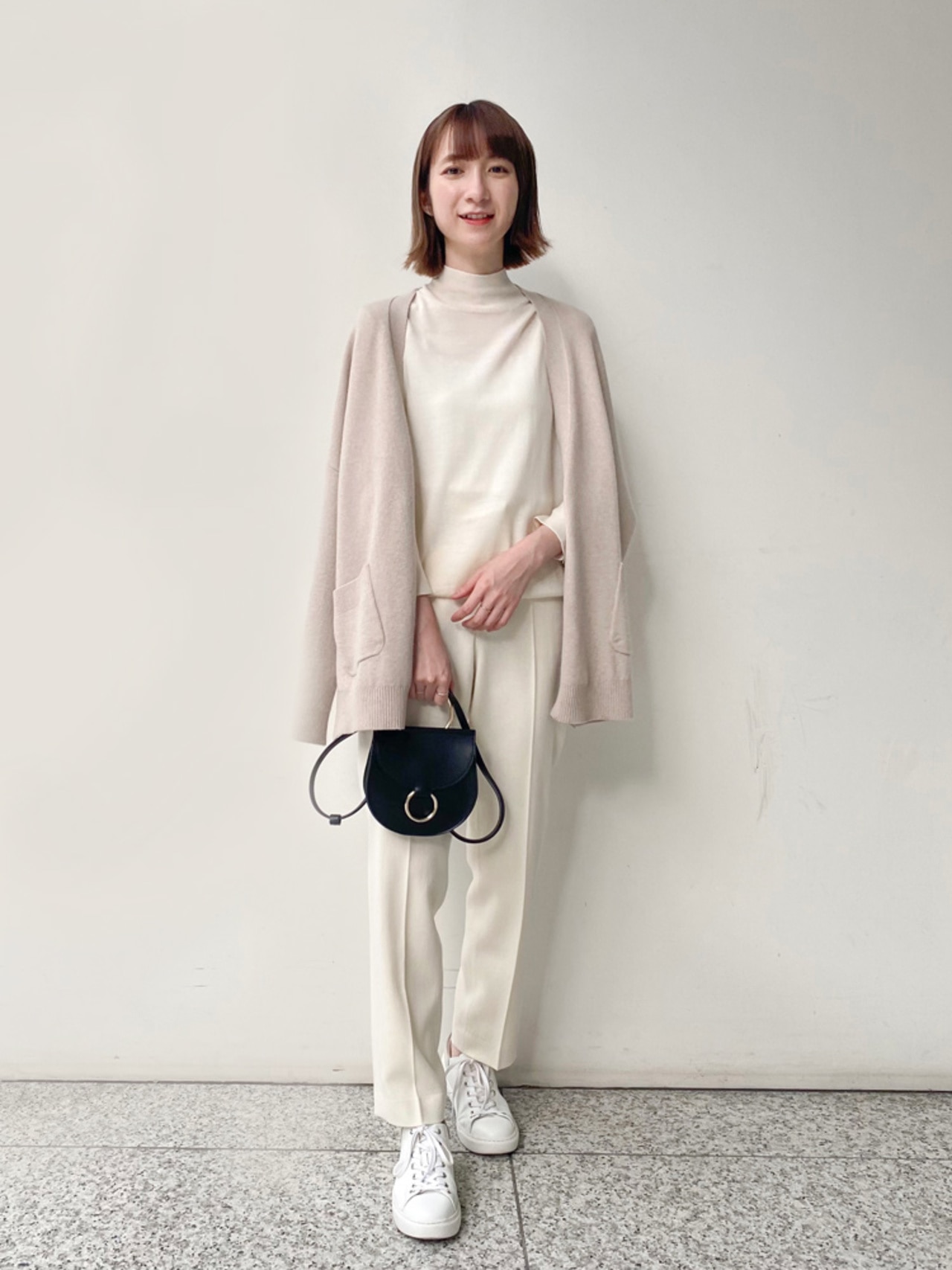 冬シーズンに色々な着こなしを楽しめるウール素材の白パンツ。今年はあえてオールホワイトで合わせるスタイルに注目です。カシミヤ混のカーディガンで上品なリラックス感を出しながら、リングハンドルのミニバッグで引き締めて。