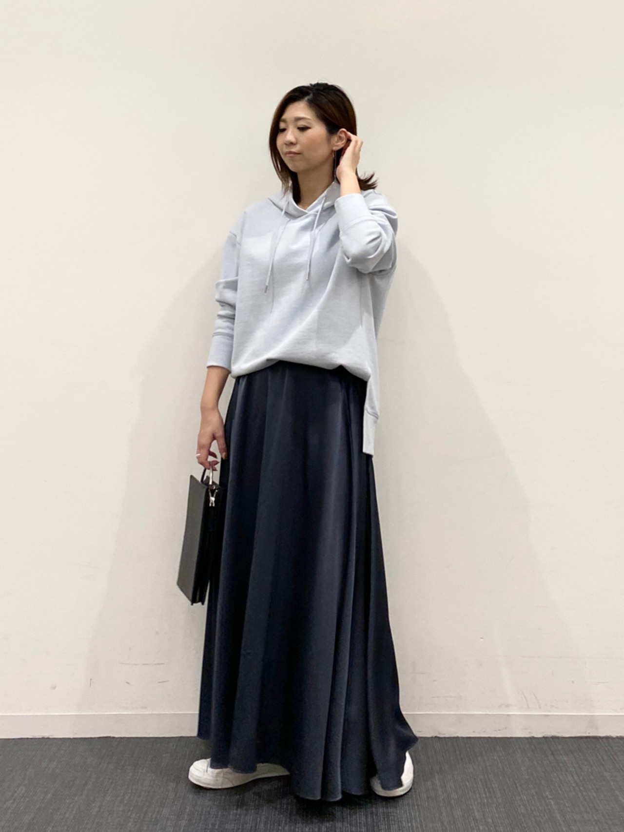 ゆったりシルエットのパーカーに濃紺のサテンスカートを合わせて、リラックス感とエレガントを持ち合わせたスタイルに。ブルー系のアイテムでまとめつつ、素材感でコントラストをつけているので、洗練された雰囲気に仕上がります。