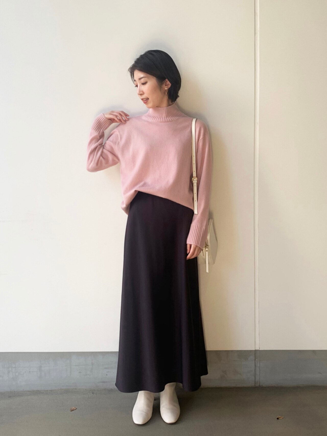 程よいゆったり感のハイネックニットを、ピンク×ブラウンの女性らしい温かみのある配色でまとめました。ツヤと揺れ感が美しいサテンスカートを合わせることで、リラクシーなニットもほっこりしすぎず大人に着こなせます。