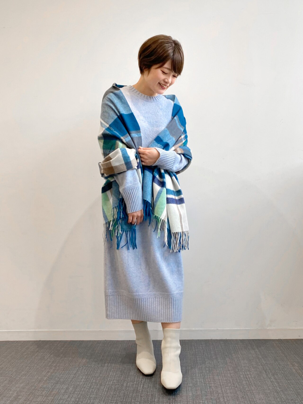 ボディラインを拾いにくいコンフォートなニットワンピは、ブルーを選ぶことで大人っぽくすっきりと着こなせます。同系色のチェックストールで奥行きをつけて、足元は今冬らしいホワイト合わせでこなれた印象に。