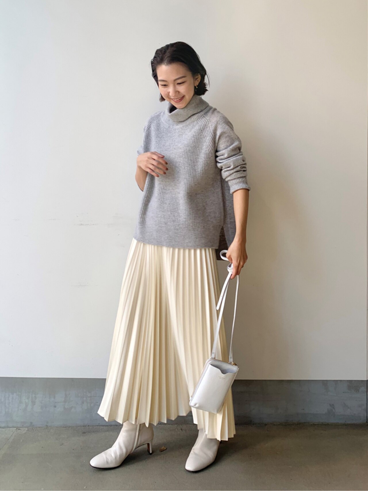 ふんわりとした質感が女性らしいグレーのニットには、レザー見えする上品なプリーツスカートが好相性。シンプルな配色でまとめながら素材感で差をつけて、甘くなりすぎずに大人のフェミニンスタイルが完成します。