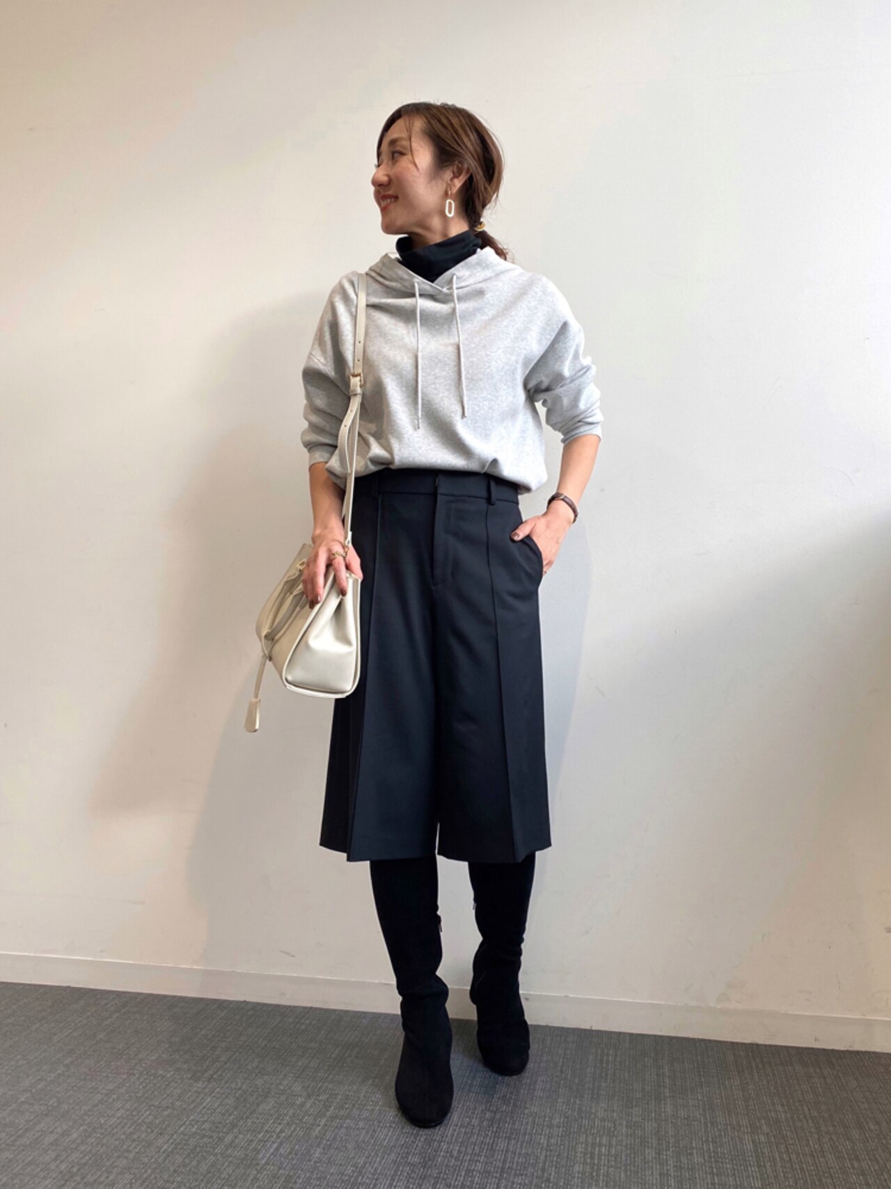 カジュアルになりがちなグレーパーカーは、ハーフパンツを中心にブラック系のアイテムと合わせて、シックな着こなしを楽しむのがおすすめ。INのタートルネックと足元のロングブーツで、今年らしい新鮮なシルエットに。