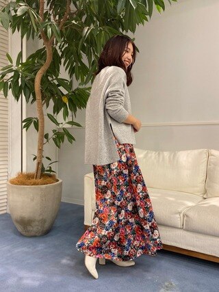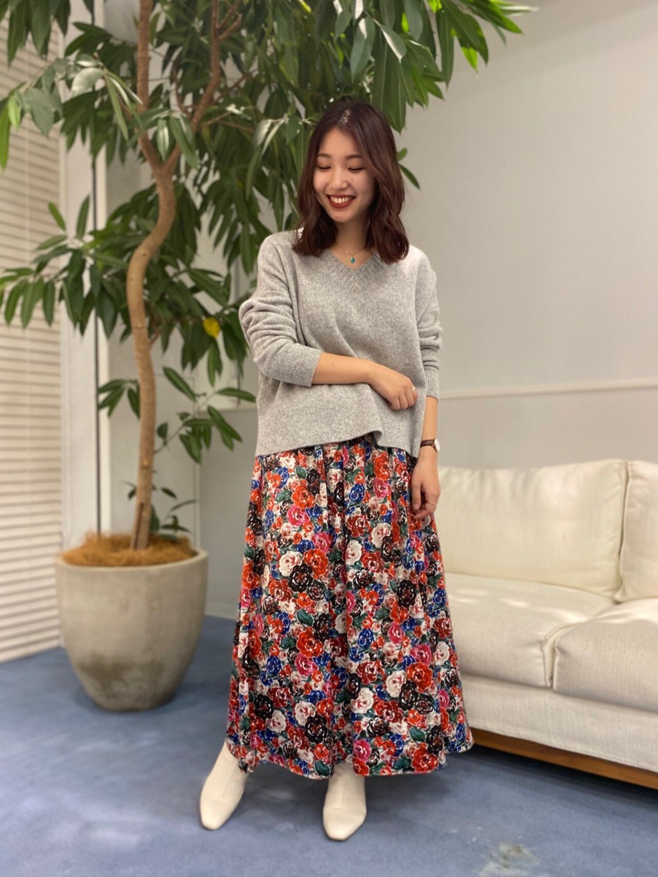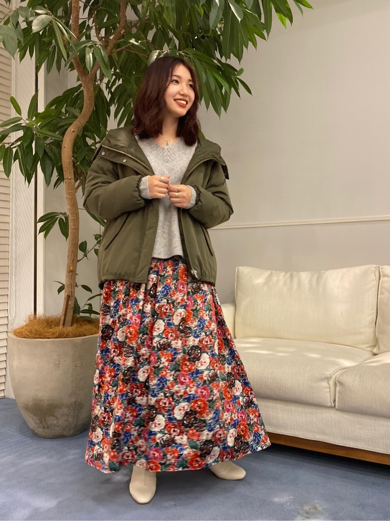コーディネートを引き立てるのは、トーンダウンしがちな冬だからこそ華やかさが映える花柄スカート。