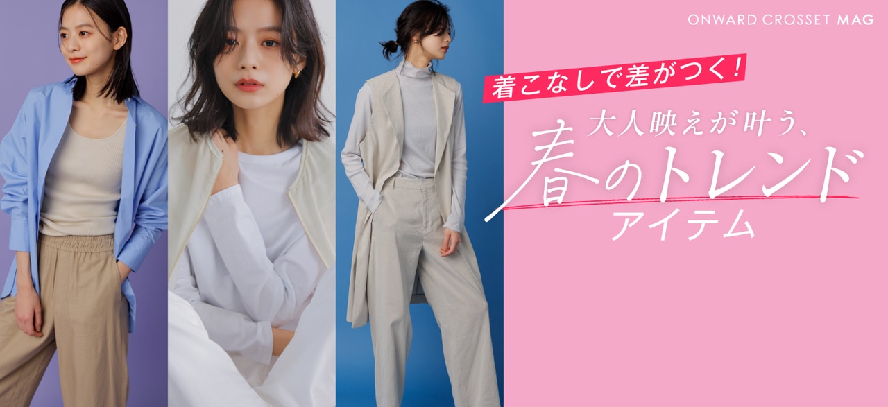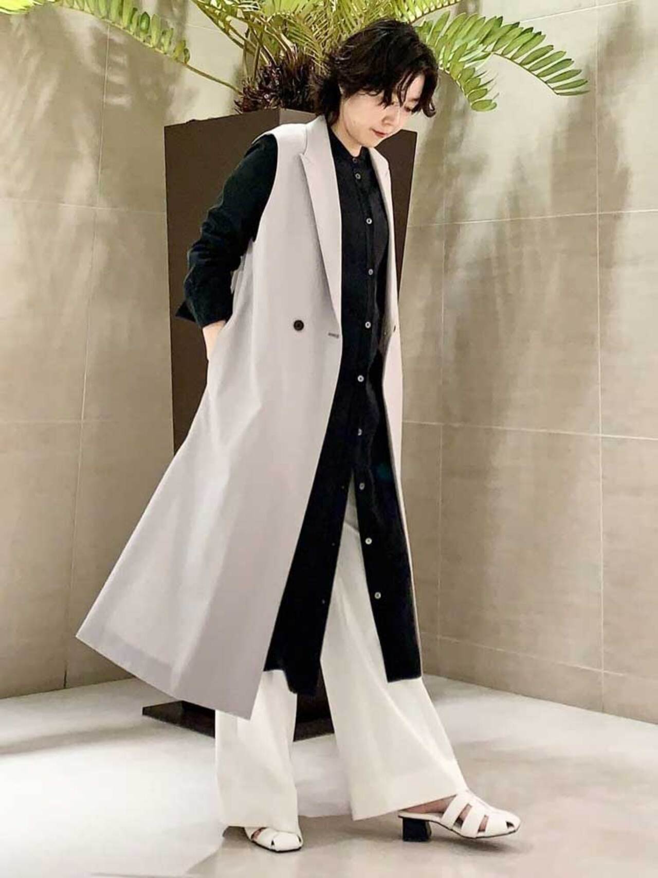 カーデとブラウスは、あえてどちらも羽織りスタイルでレイヤード。オーバーサイズのトップスをばさっと羽織っただけの無骨さと、フィット感のあるインナーでヘルシーに肌見せしたバランスが今年らしい。