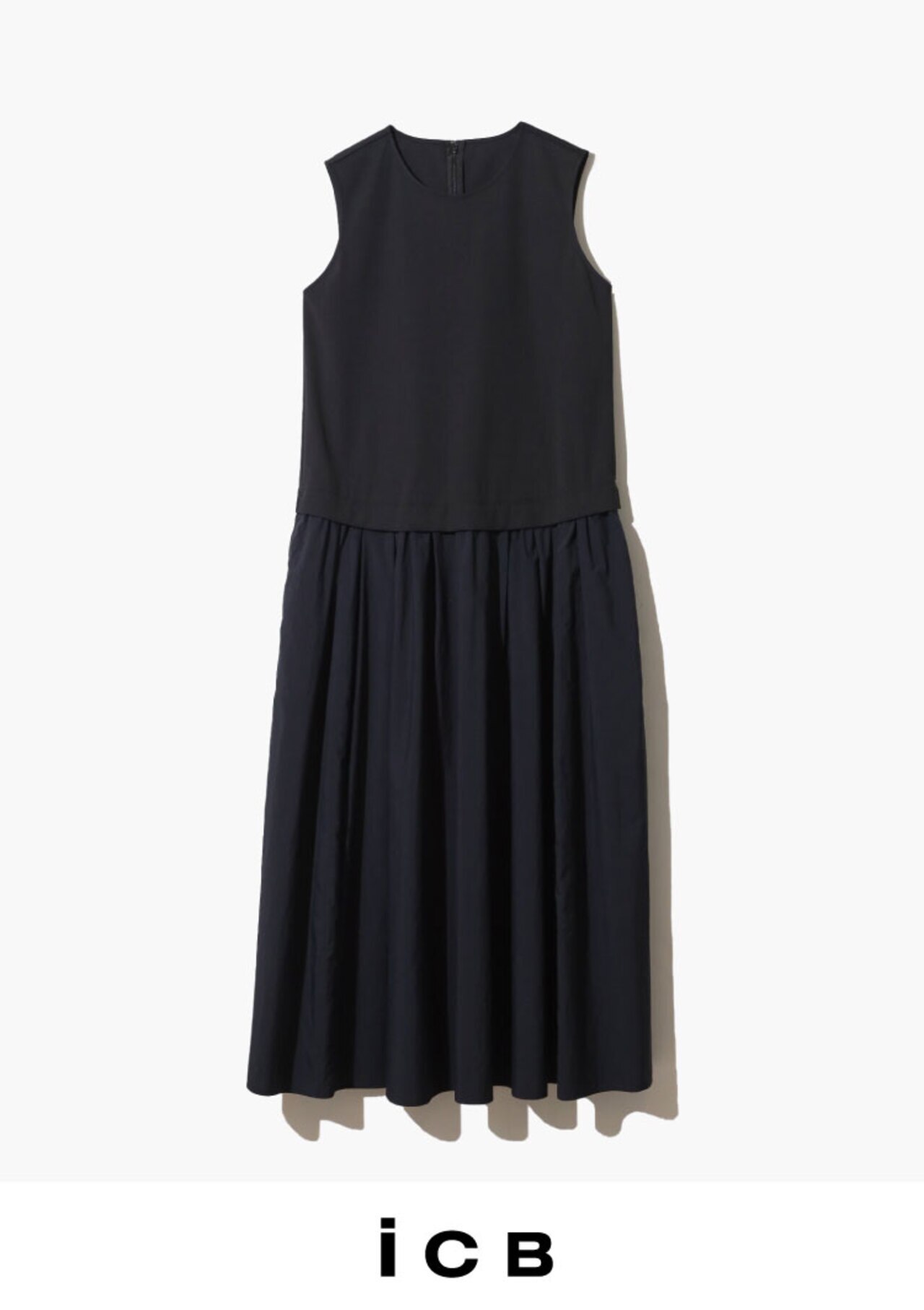 ボディラインを拾わないリラックスしたシルエットながら、異素材コンビでメリハリのある印象に。スカート部分は撥水加工を施し、手洗い可能で清潔感キープ。