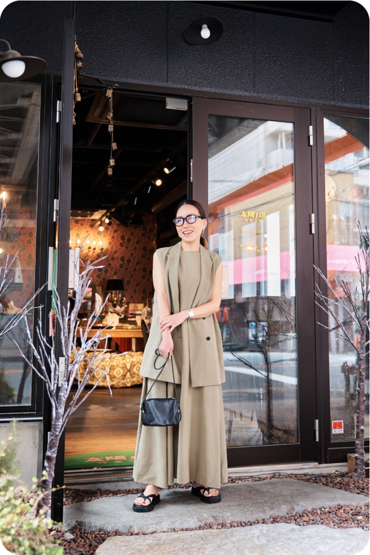 今日はワンピースとジレのセットアップ。カーディガン以上、ジャケット未満のきちんと感があるジレは大人のお出かけには最適。シャープなジレとたっぷりフレアのワンピースで縦長ラインを意識したスタイルアップコーデです。