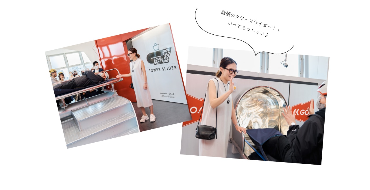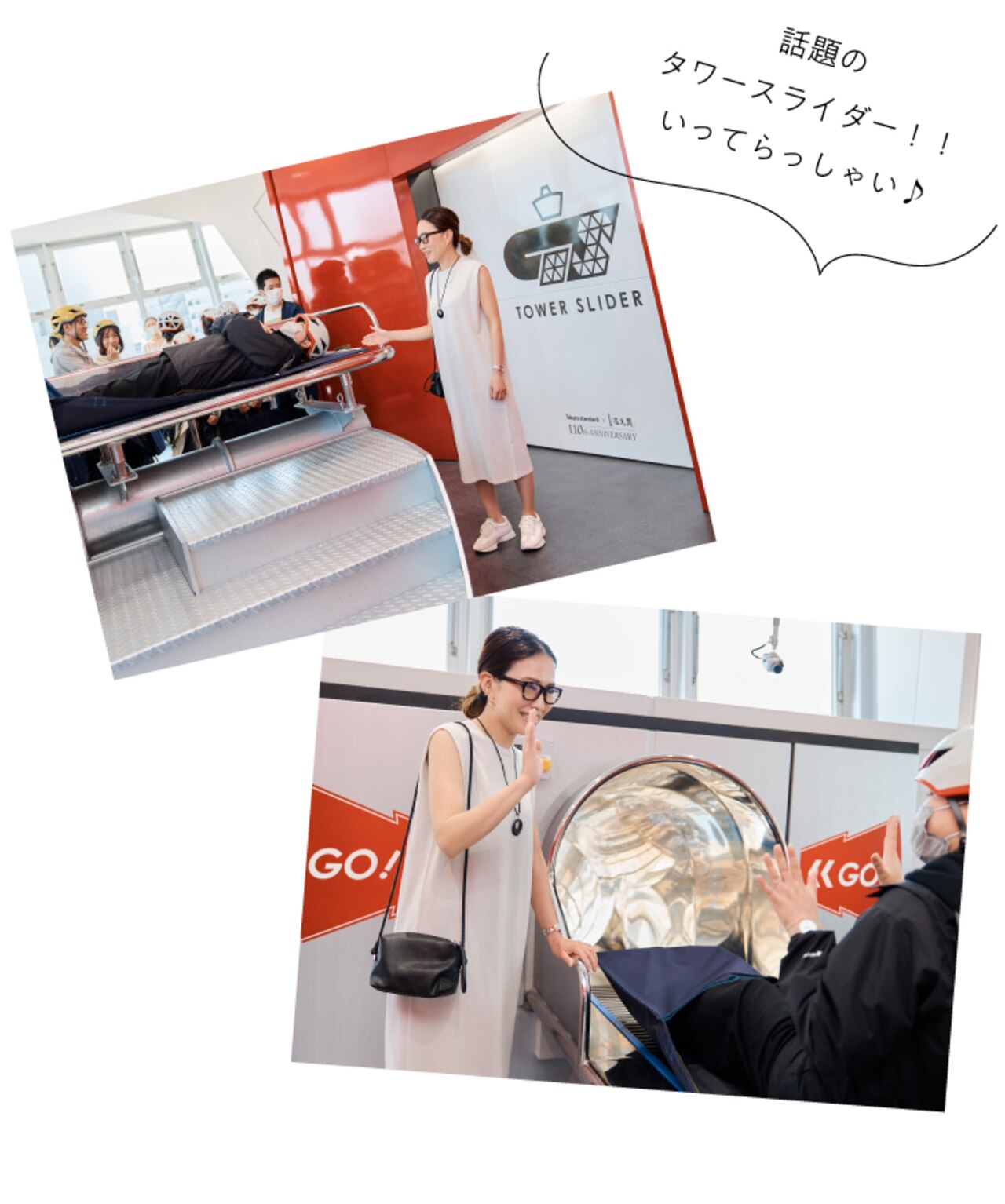 通天閣の新名物「TOWER SLIDER(タワースライダー)」。中間展望台から地下一階まで通天閣の外観を1 回転半しながら約10 秒で滑り降りる体感系スライダー!平日も行列になる大人気アトラクションです。滑る前には「行ってきます♪」の記念動画撮影もあり、希望の方は滑り終えた後、購入も可能。大阪の景色を見ながらレッツスライド♪
