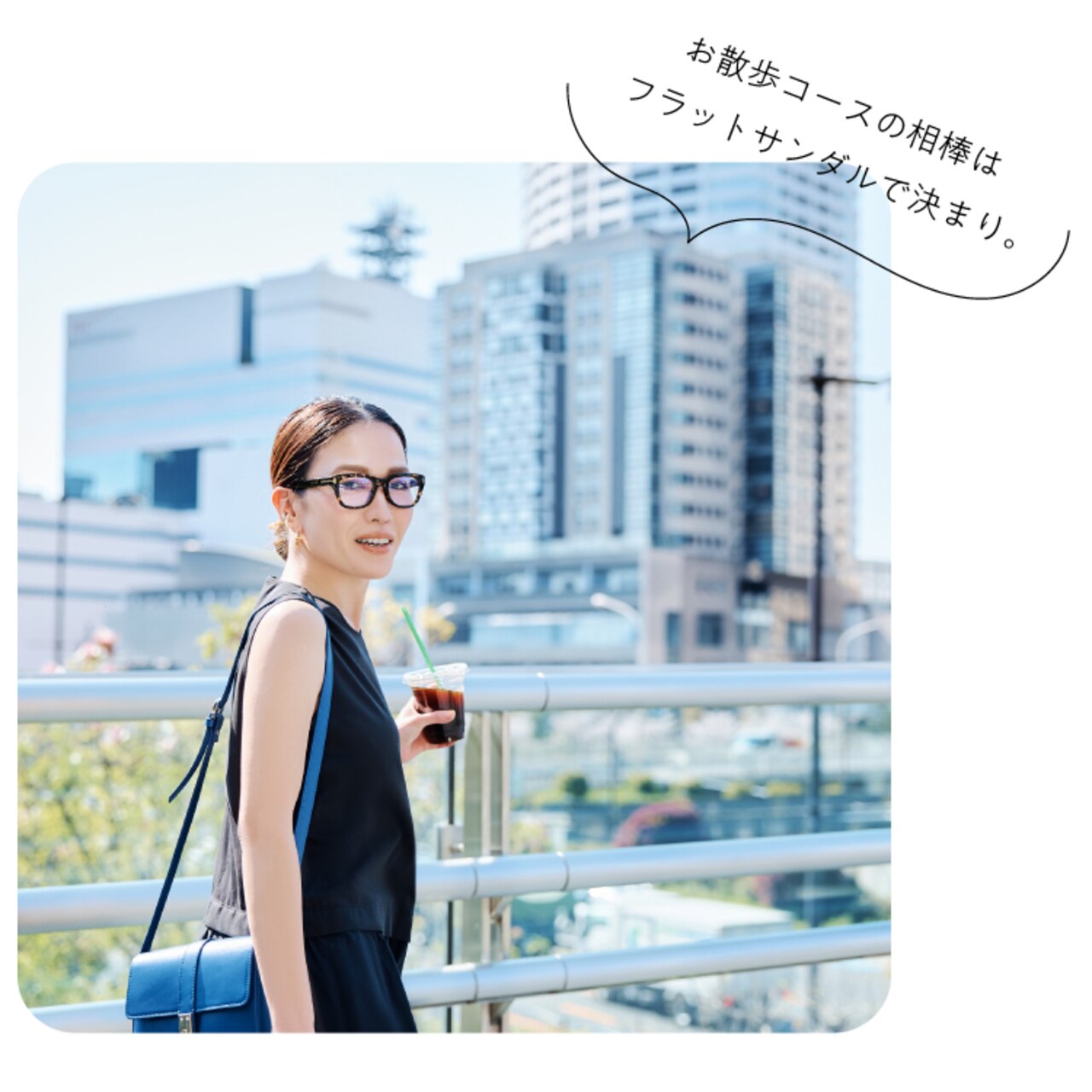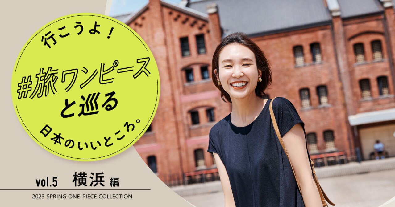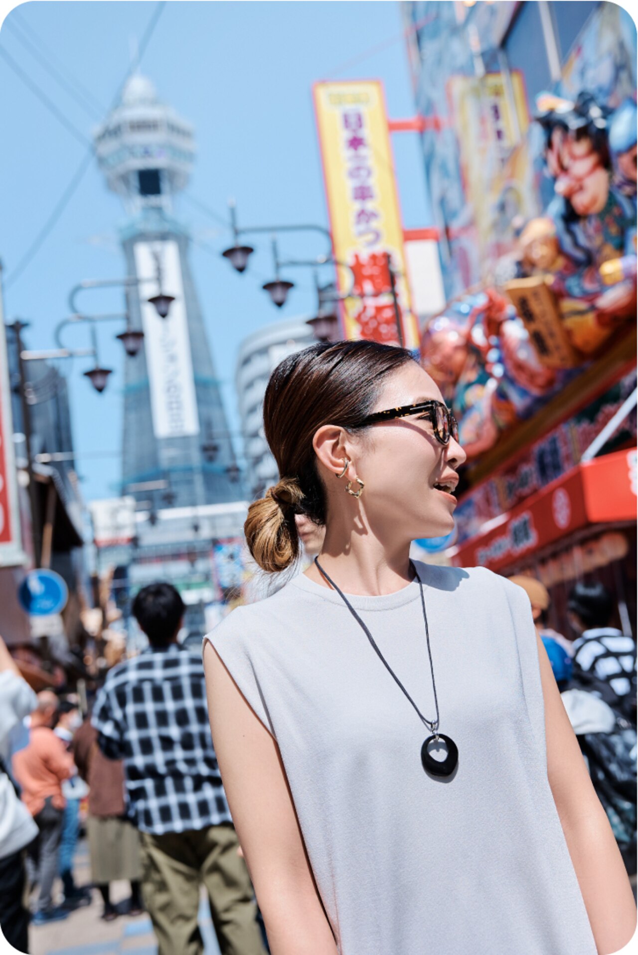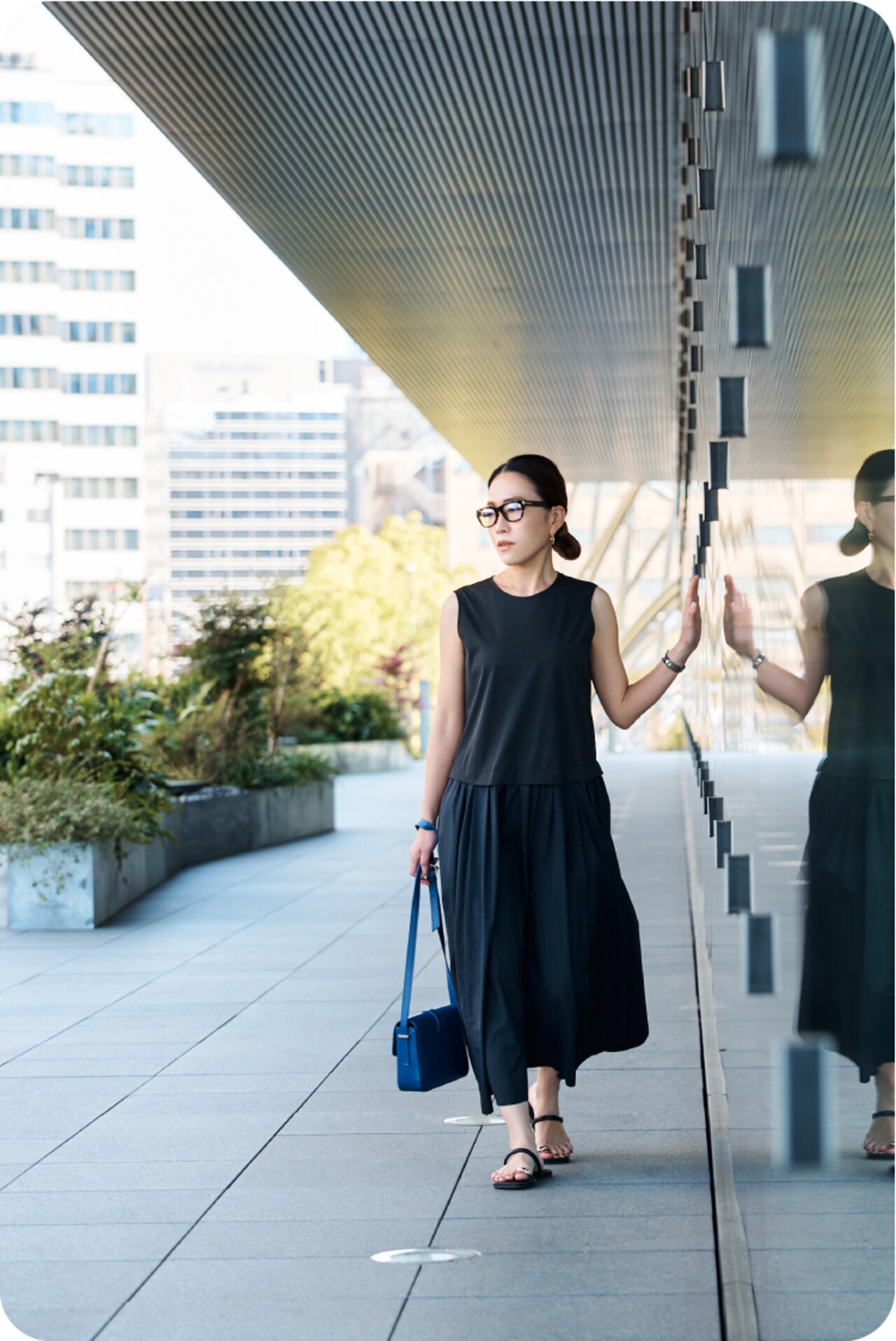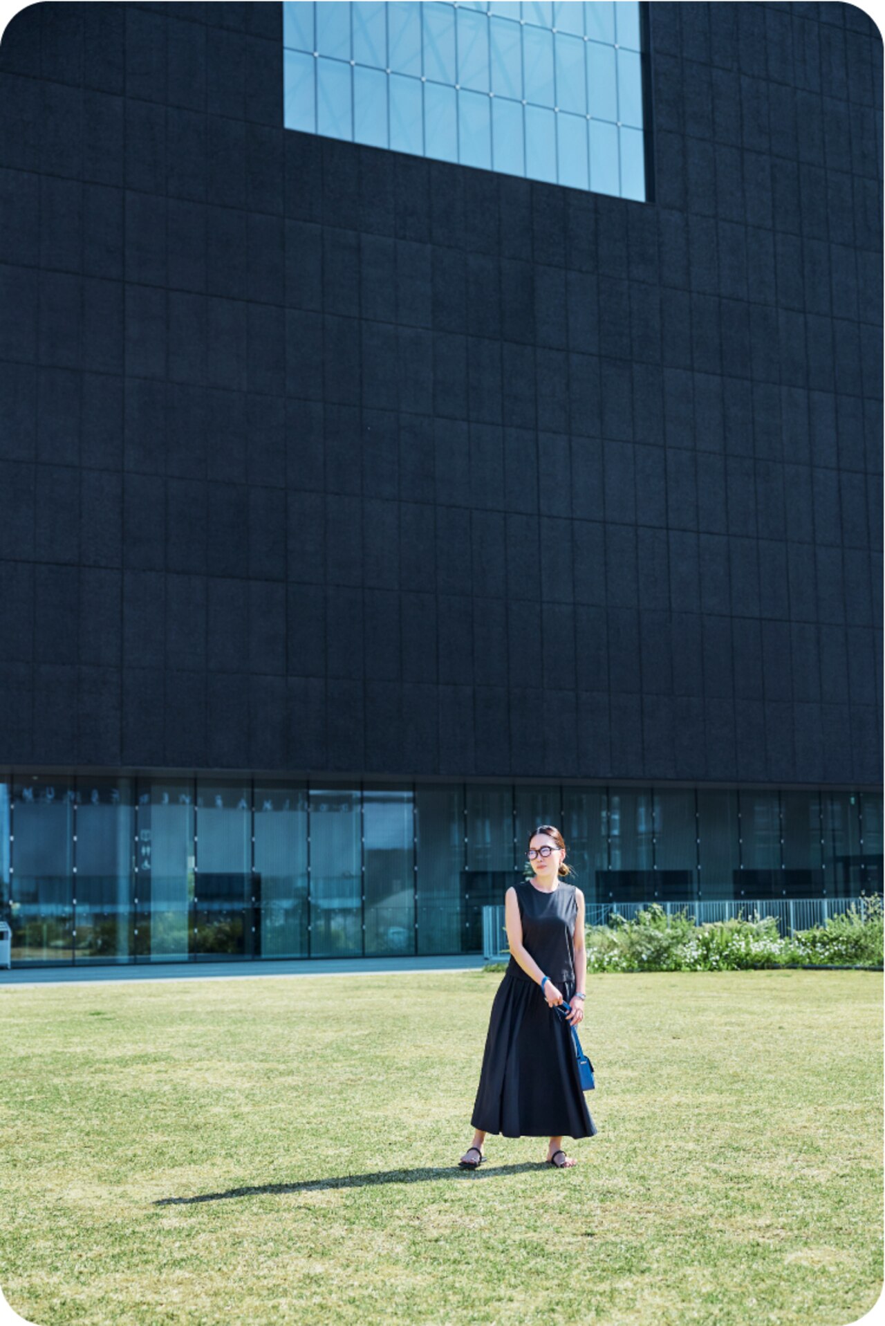 素材のコンビネーションが洗練された印象。シンプルなブラックドレスで出かけるのは、最近できた美術館エリア。レトロな建築が当時のまま活かされている街並みには、数々の登録有形文化財も。一方近代的な建築と共存するのがこの街の面白さ。