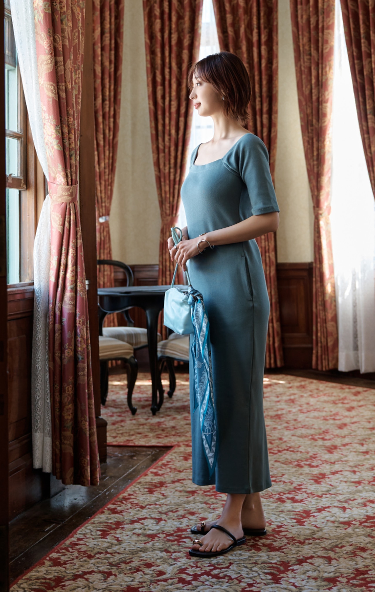 デコルテをすっきりきれいに見せてくれるスクエアネックワンピ。ニットのようにストレッチが効いて動きやすい。縦ラインが協調されすらっと見えるから、カジュアル過ぎずきれいめに着こなせます。フィットしたシルエットながらも気になる二の腕はしっかりカバー。バックスリット入りで足さばきもよく、街歩きにもピッタリ。