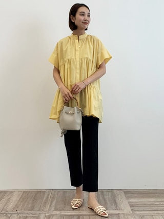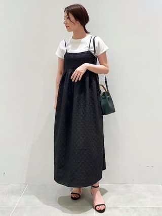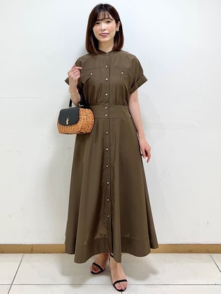 涼感素材が心地良い、組曲のワンピース。ウエストゴムで締め付けすぎず、袖もゆったりなのできれいめな見た目ながら着心地はリラクシー。程よい光沢とゴールドボタンで品よく着こなせるので、旅先できちんとした場所に行く際にも頼りになる一枚。