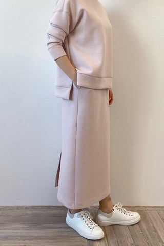 カジュアルなスエットアイテムとくすみピンクのかけ合わせが、大人でも抵抗なく着られる秘訣。ポケット付きだから、ちょっとした外出時にも重宝して嬉しいポイント。