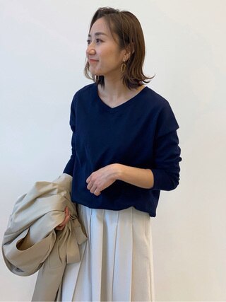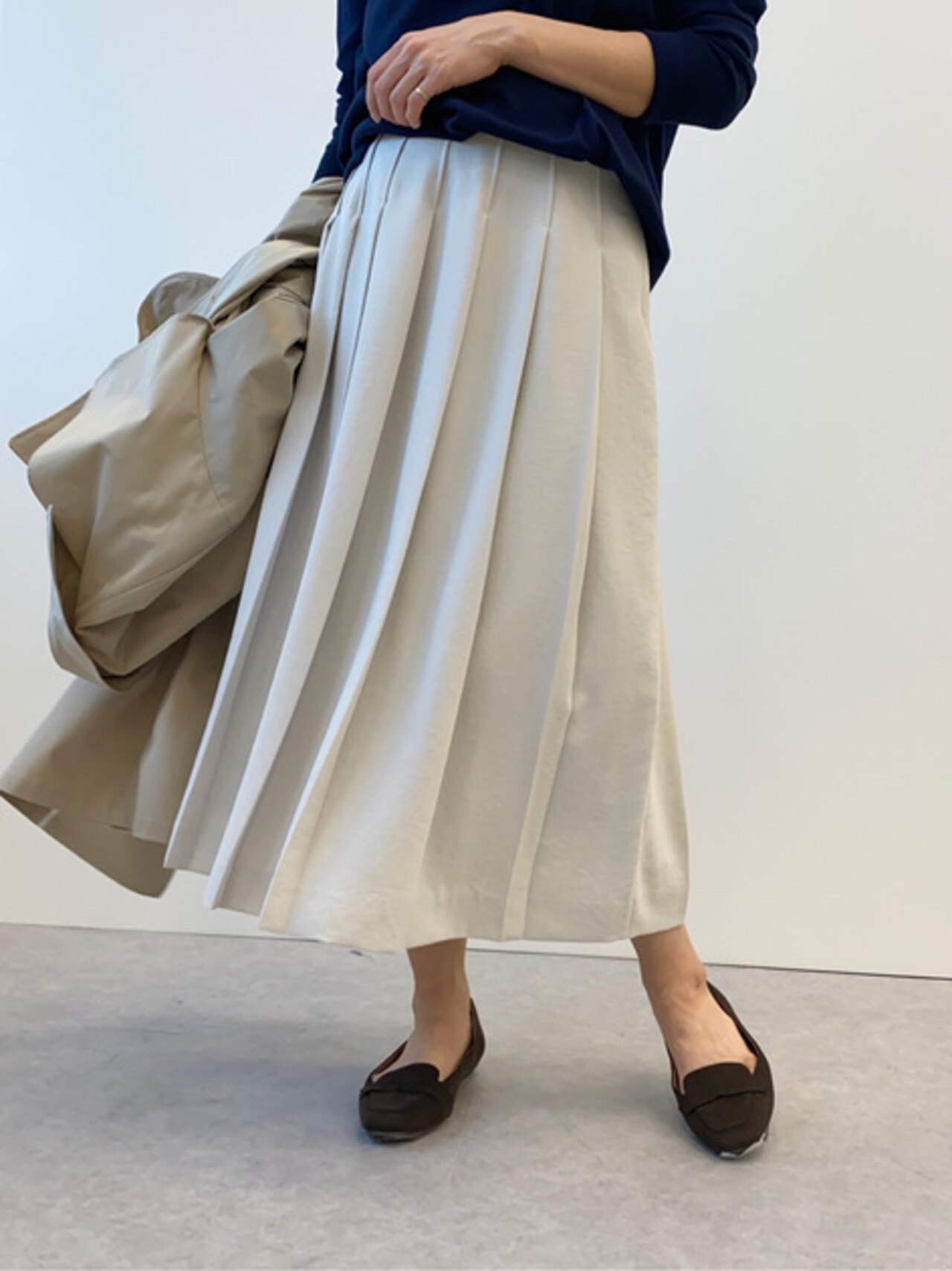 今回は軽くて落ち感のある春らしい素材のプリーツスカートと合わせて、お仕事にも着ていける上品カジュアルなコーデに。