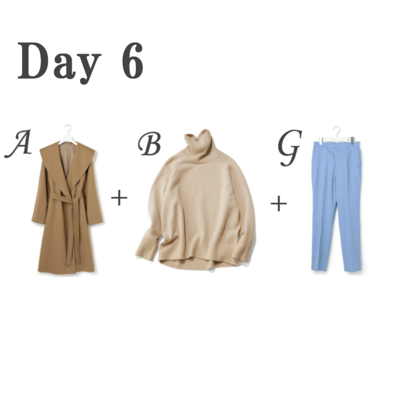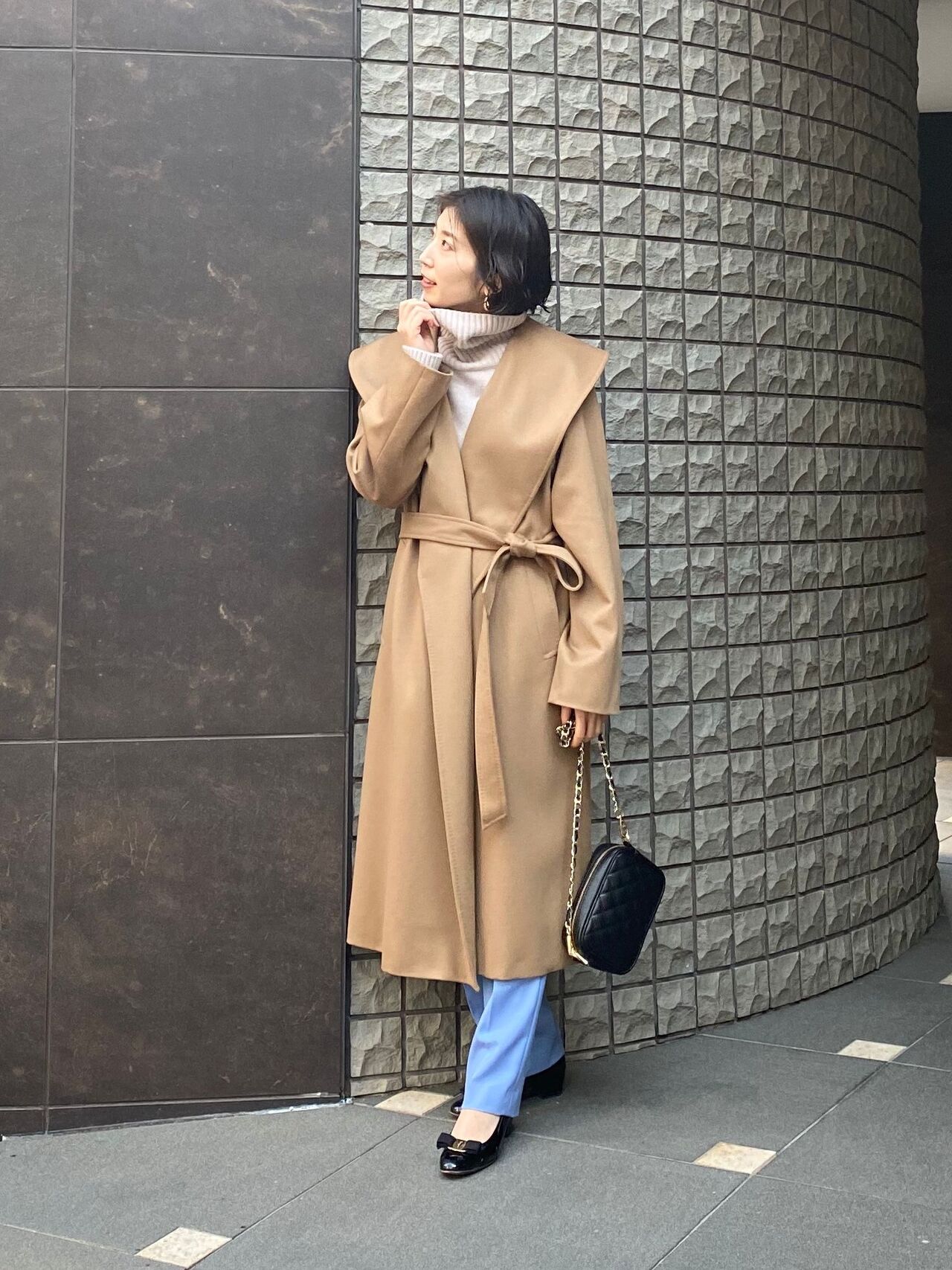 気温のが低い日は、コートはウエストマークして防寒対策はしっかりと。ベーシックなカラーに、さりげなく色物を合わせるのが今っぽいアクセントに。パンツなら主張が強くなりすぎず、旬な装いに仕上がる。