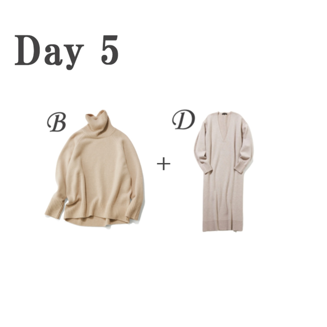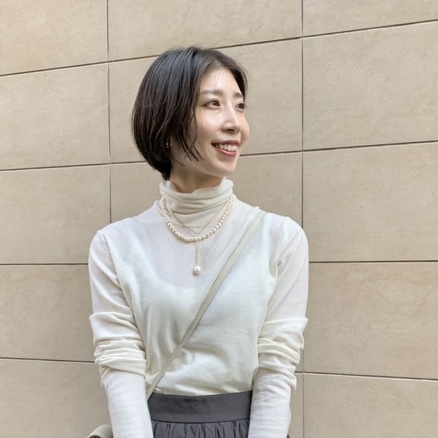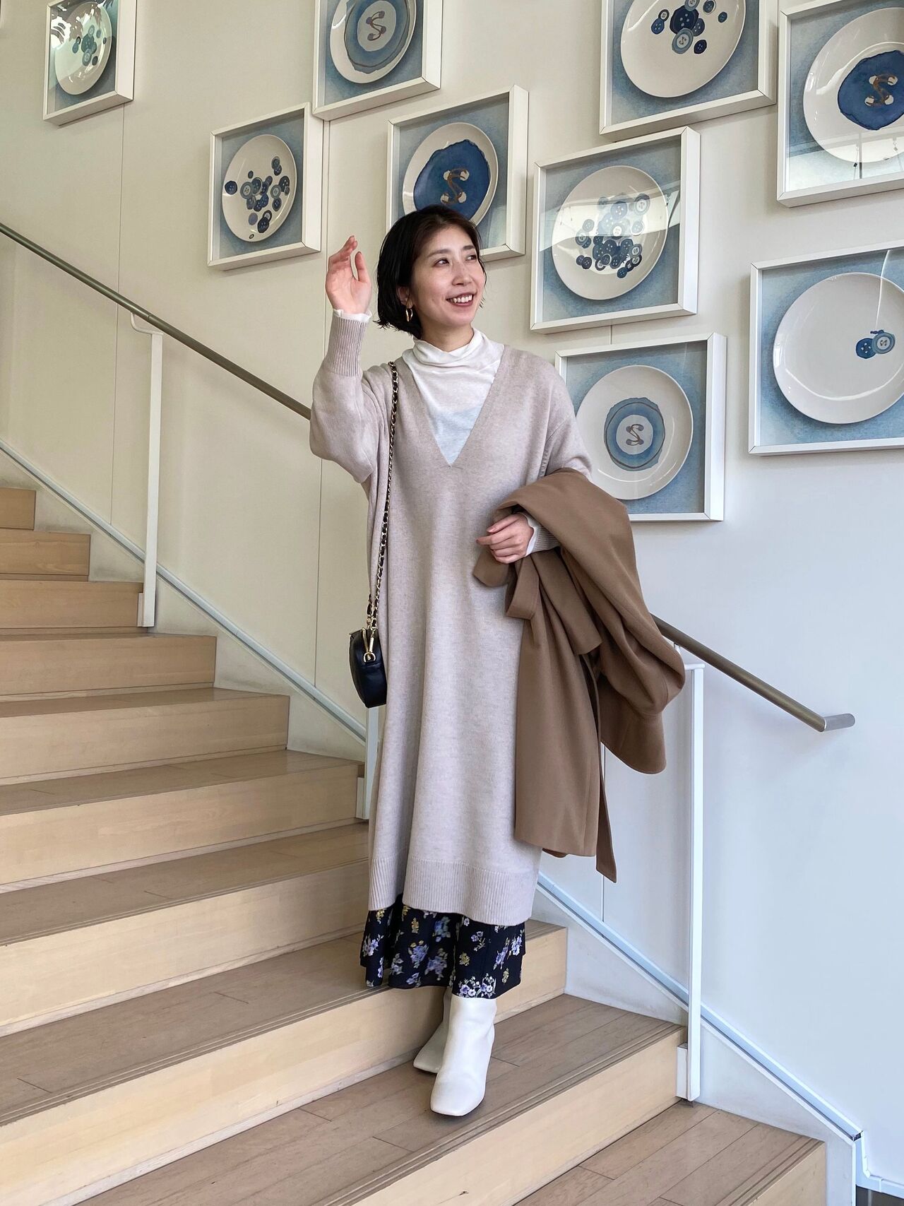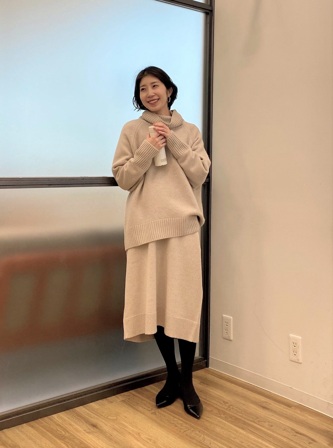 同系色のハイネックニットとワンピースを合わせて、セットアップ風の着こなしに。簡単だけどひと工夫している感じが、おしゃれ度を高めてくれる。