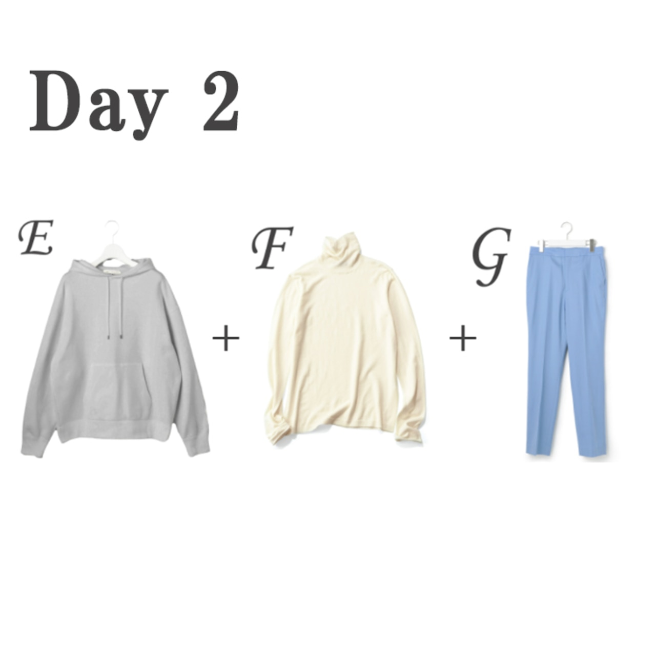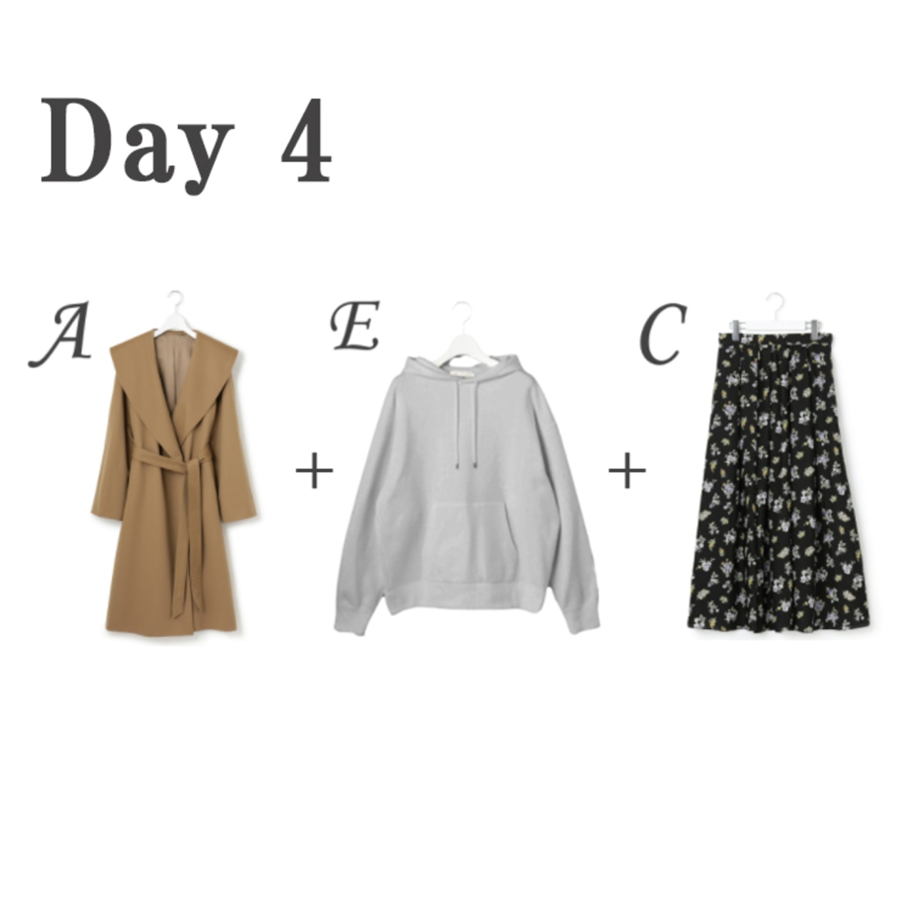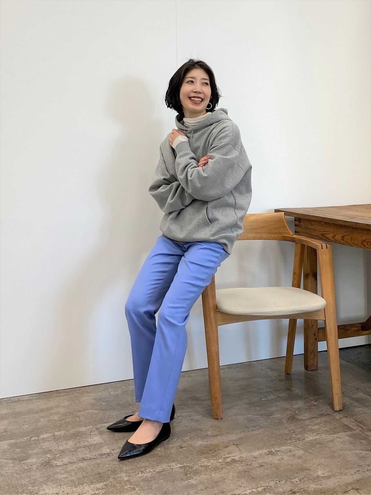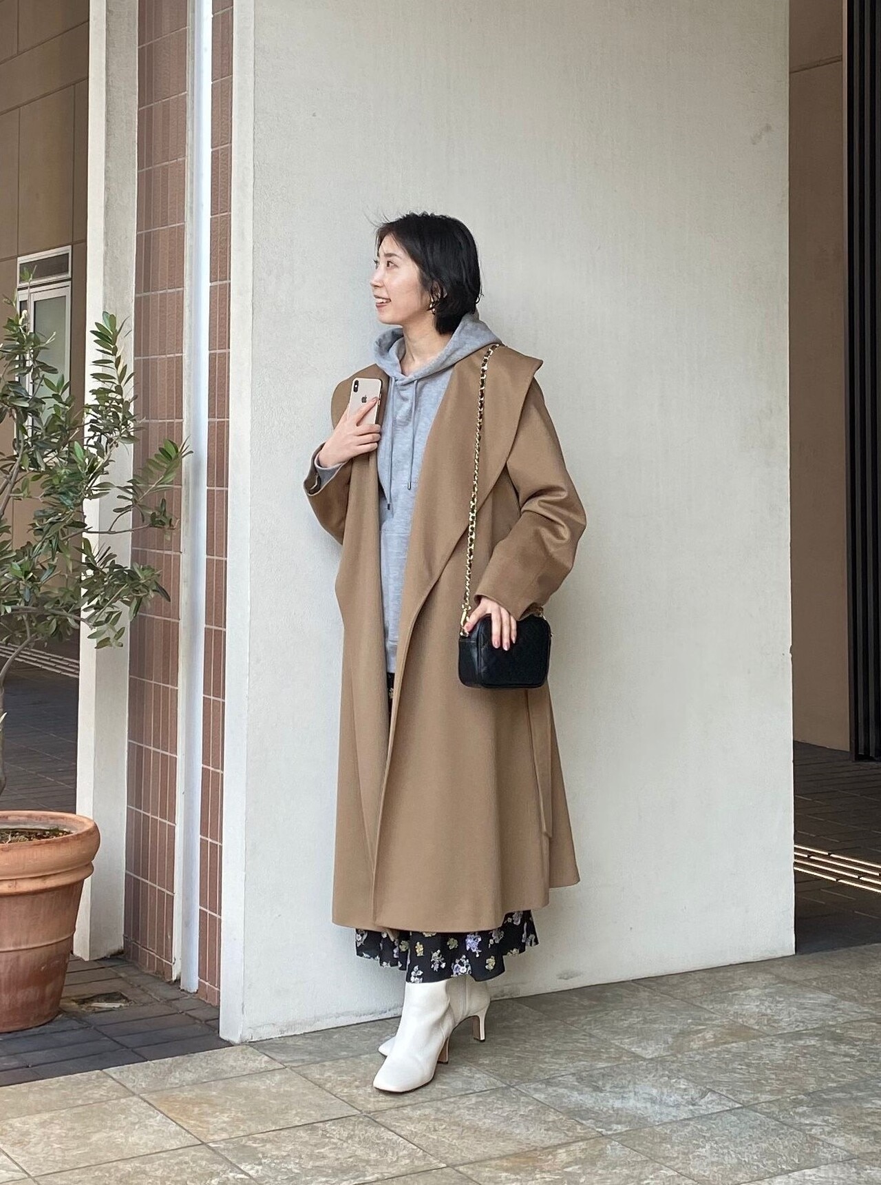 パーカー×スカートのキレイめカジュアルミックス。家では楽ちん、突然のお出掛けでもコートをバサッと羽織るだけで品さのある装いに。