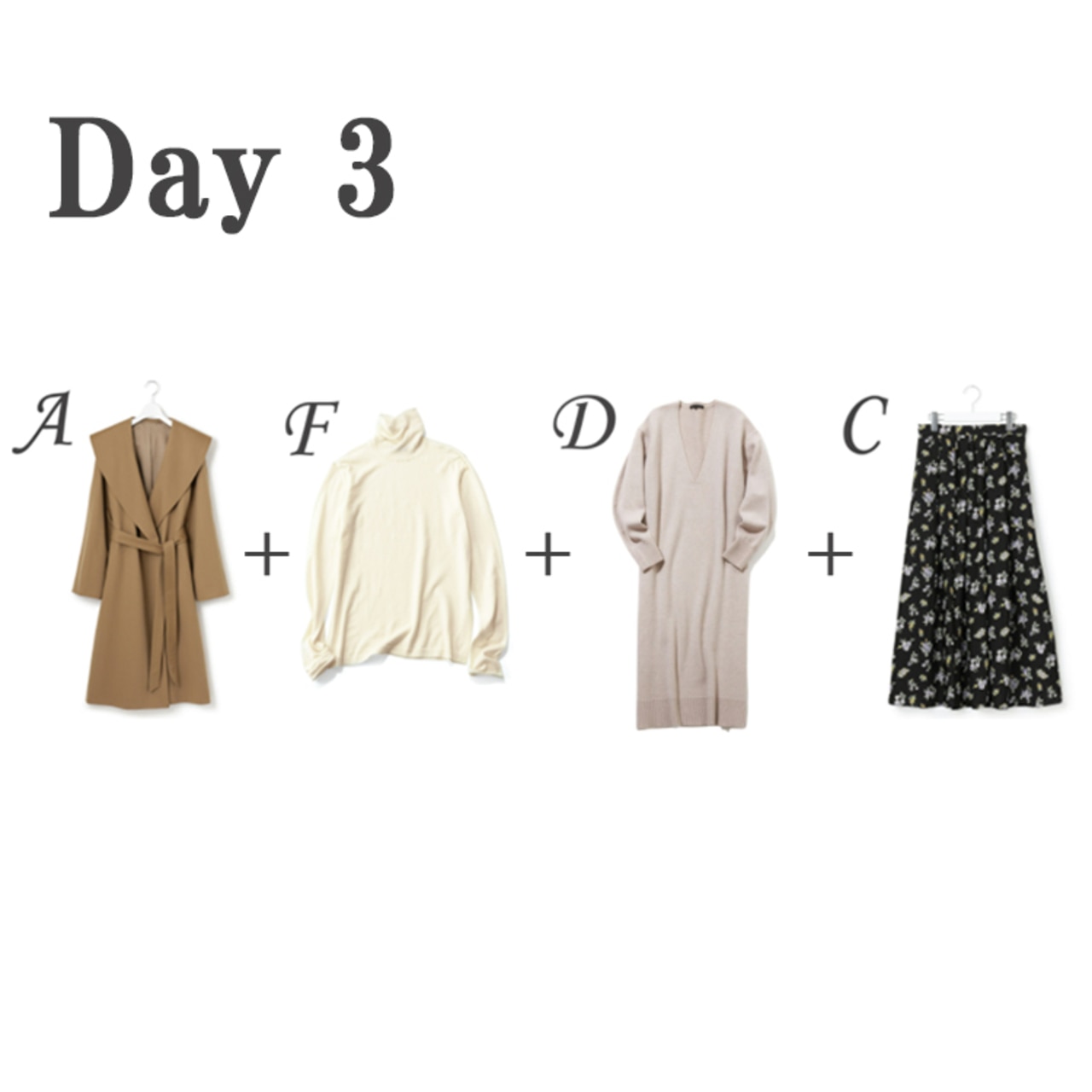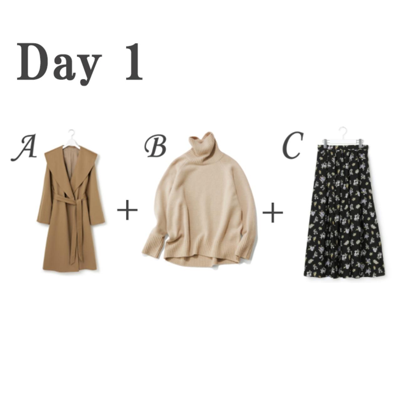 きちんとした場所でもOKな花柄スカートが主役のスタイル。首がつまりすぎないゆとりのあるハイネックと、後ろウエストゴムで実はノンストレス。地味になりがちな冬コーデに、花柄スカートは使えます!