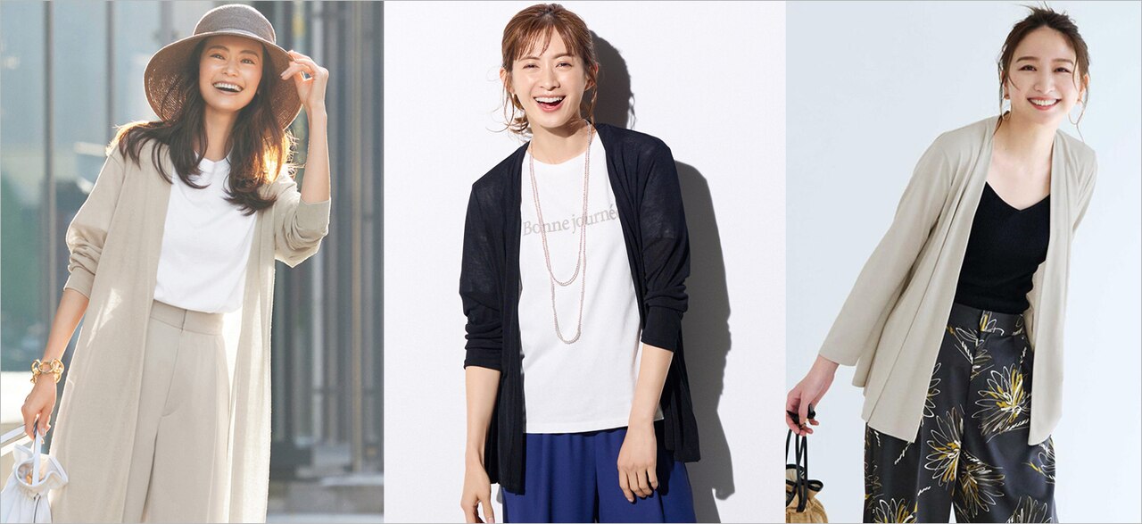 夏羽織の定番、着流しカーデをジャケット感覚でさらりと羽織れば、きれいめワンピとも好バランス。暑い季節の羽織に欠かせないUVカット・接触冷感機能に加え、抗菌防臭・撥水機能つきなのも嬉しい。