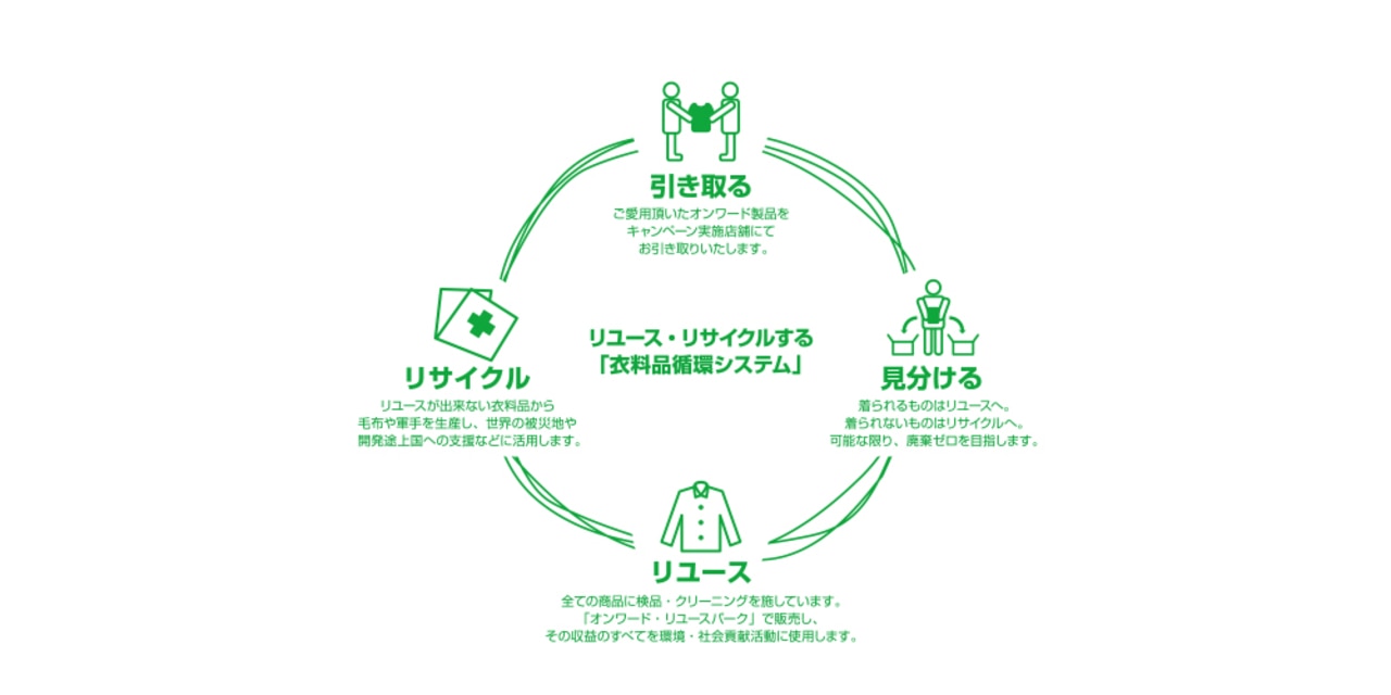 「オンワード・グリーン・キャンペーン」では、クローゼットに眠っているオンワード製品をお引き取りし、リサイクル・リユースに努めます。