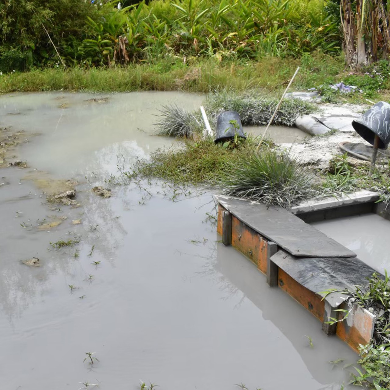 染め体験で訪ねた奄美大島の染工所では、本藍染めの青、草木染めの黄色、泥染めの黒を重ねていき、絵の具のように色を出す染め方をしていました。どの染色方法も原料は自然のものだけを使っているので、環境に影響がありません。泥染めに使う泥は染工所の裏庭の池の中にあり、作業をする場所に生き物が入ってこないように囲いがあるだけでそのまま池に繋がっていました。