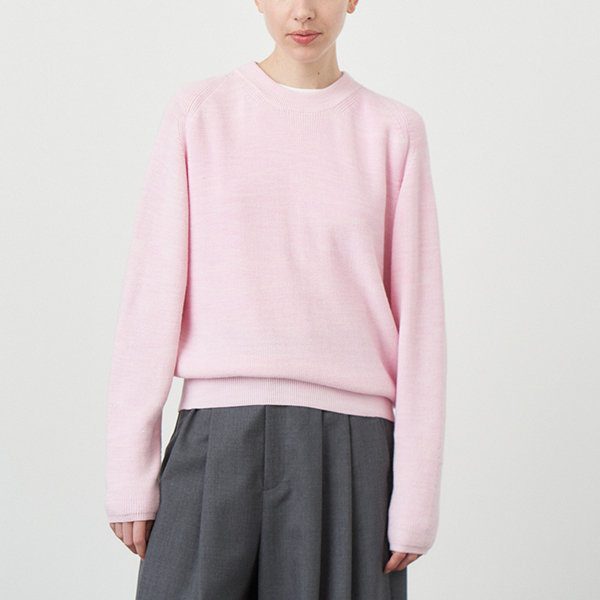 レギュラーシルエットのクルーネックプルセーター。畦編みの目立てがデザインポイントです。