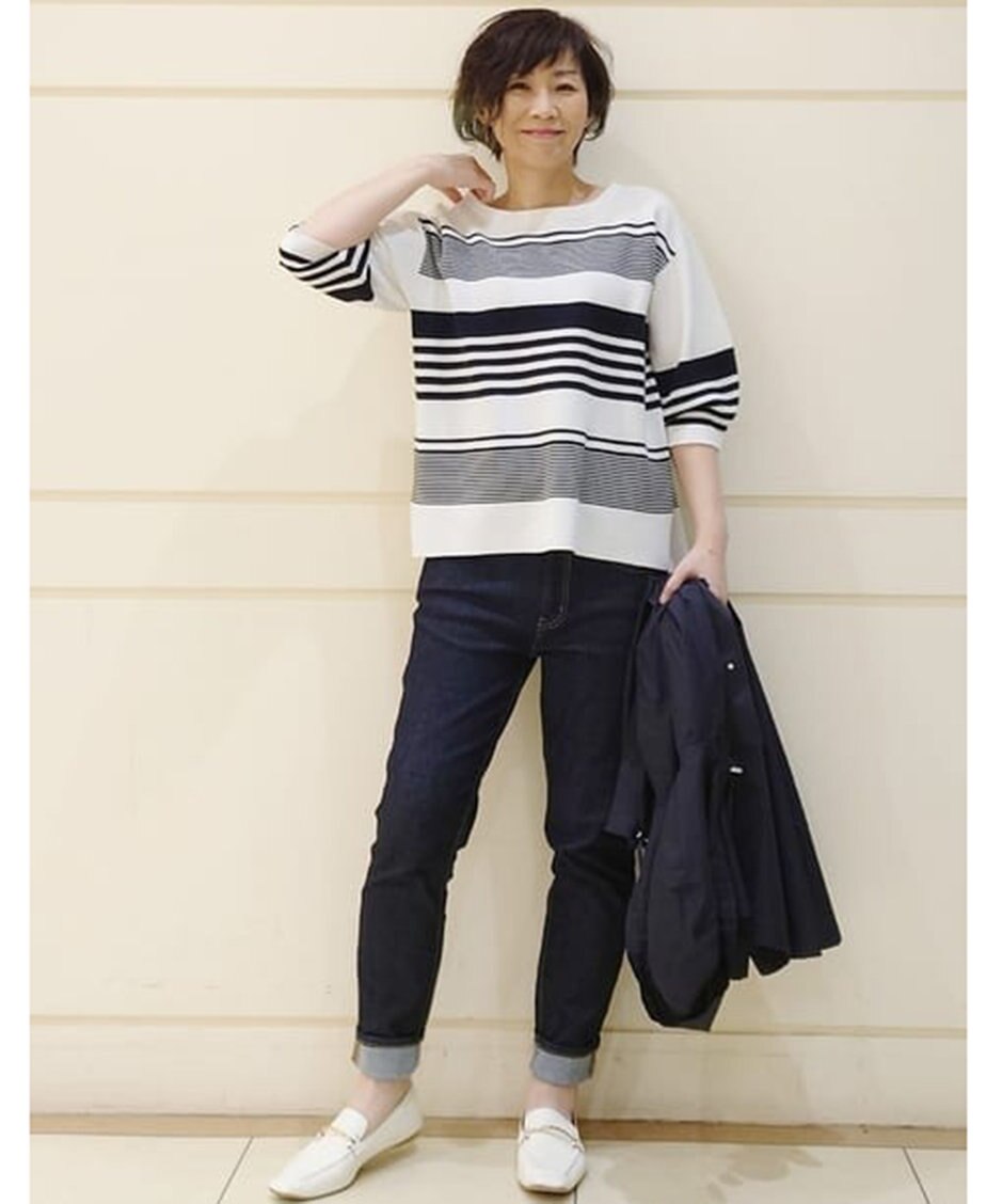 04.裾をロールアップして春らしく。マルチボーダーニットを合わせた大人カジュアルスタイル。