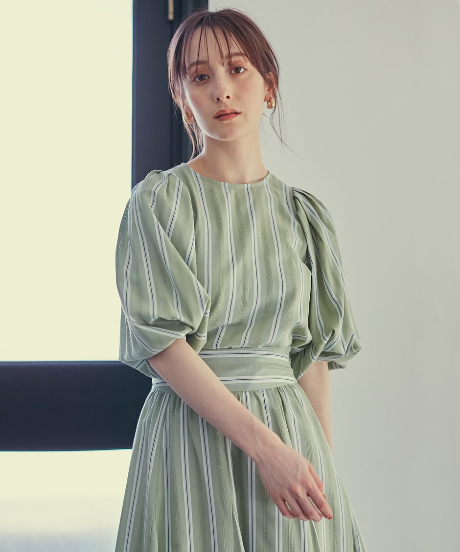肩~袖口にたっぷりとギャザーを施し、立体的なシルエットに仕上げたデザインスリーブが印象的。