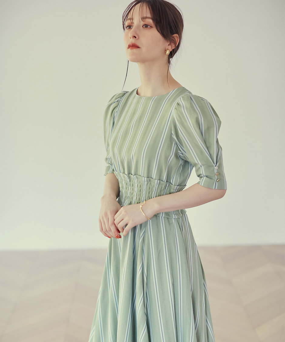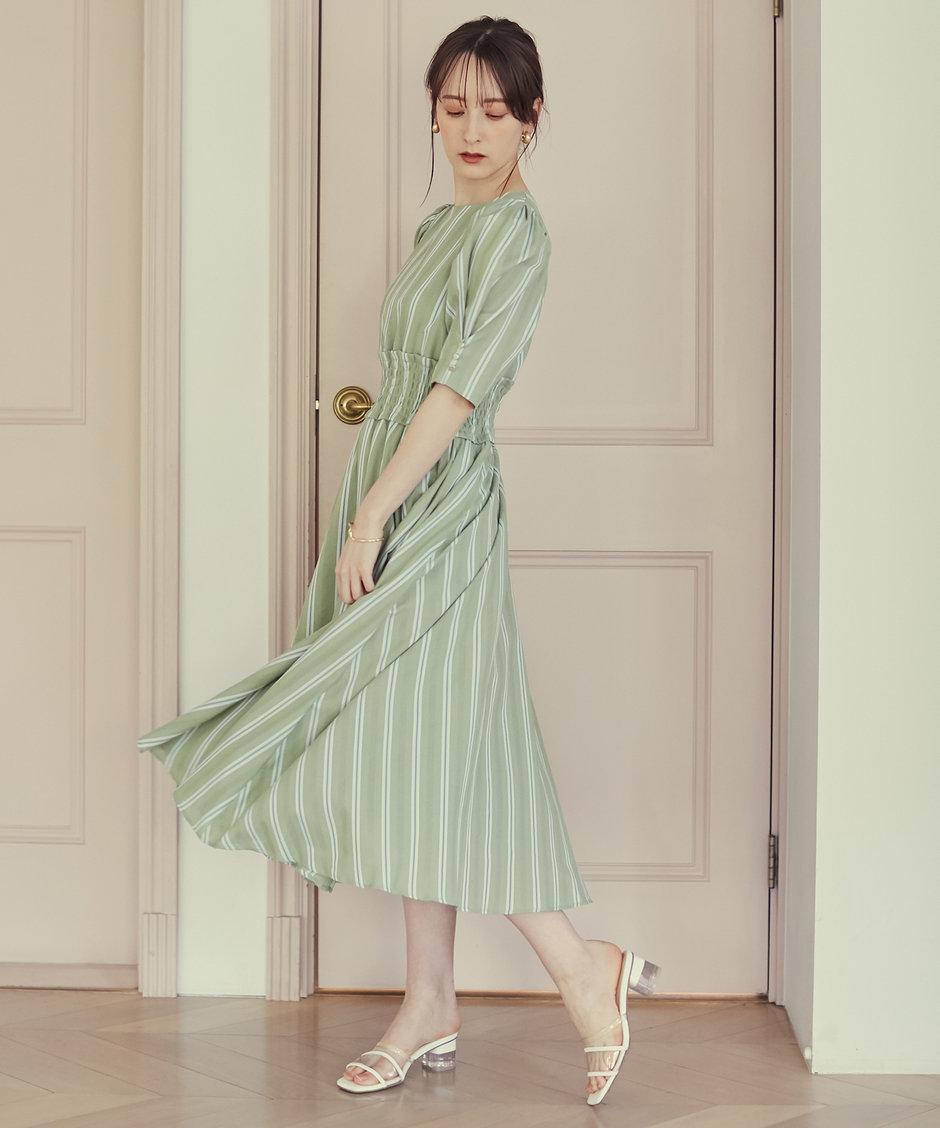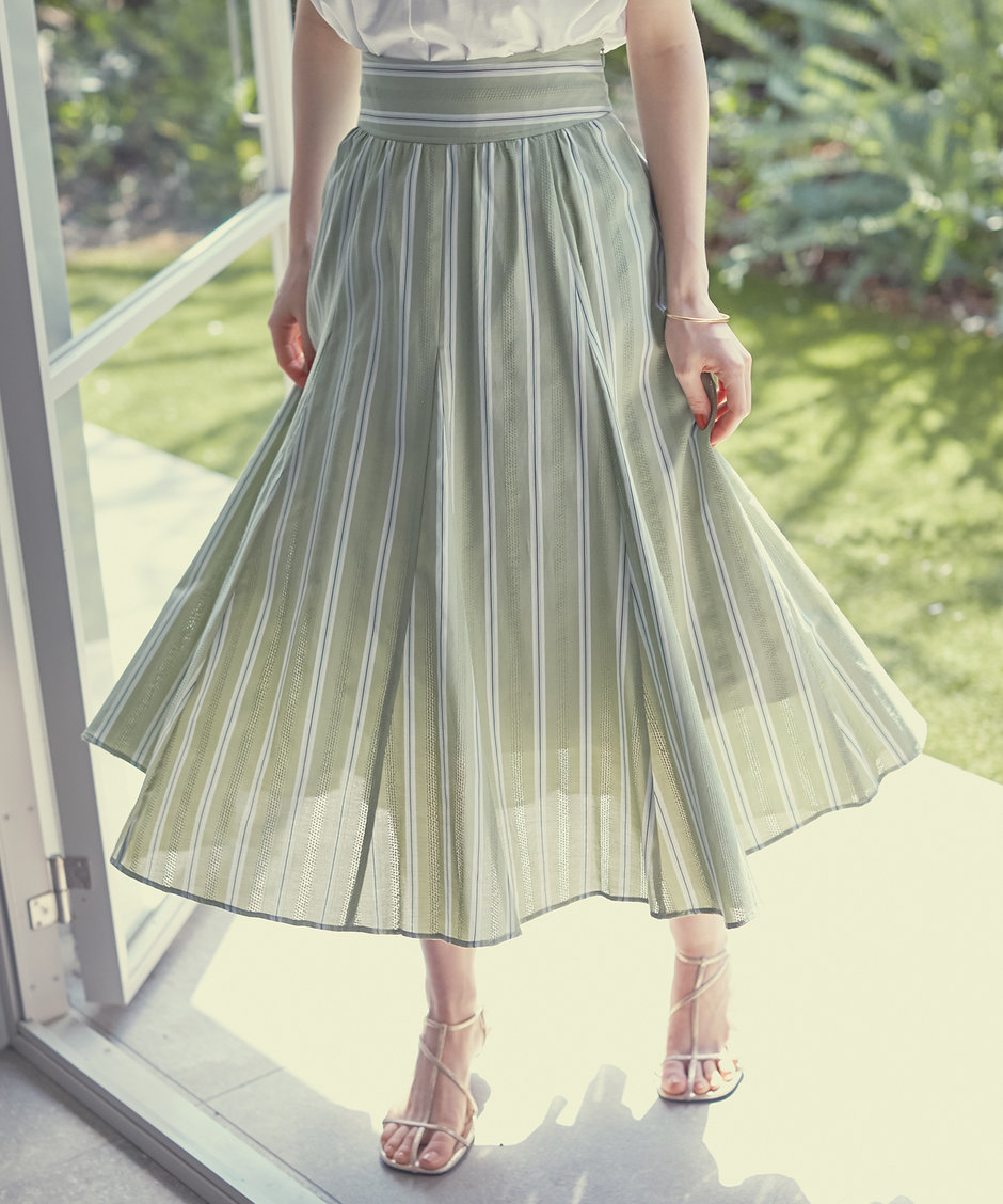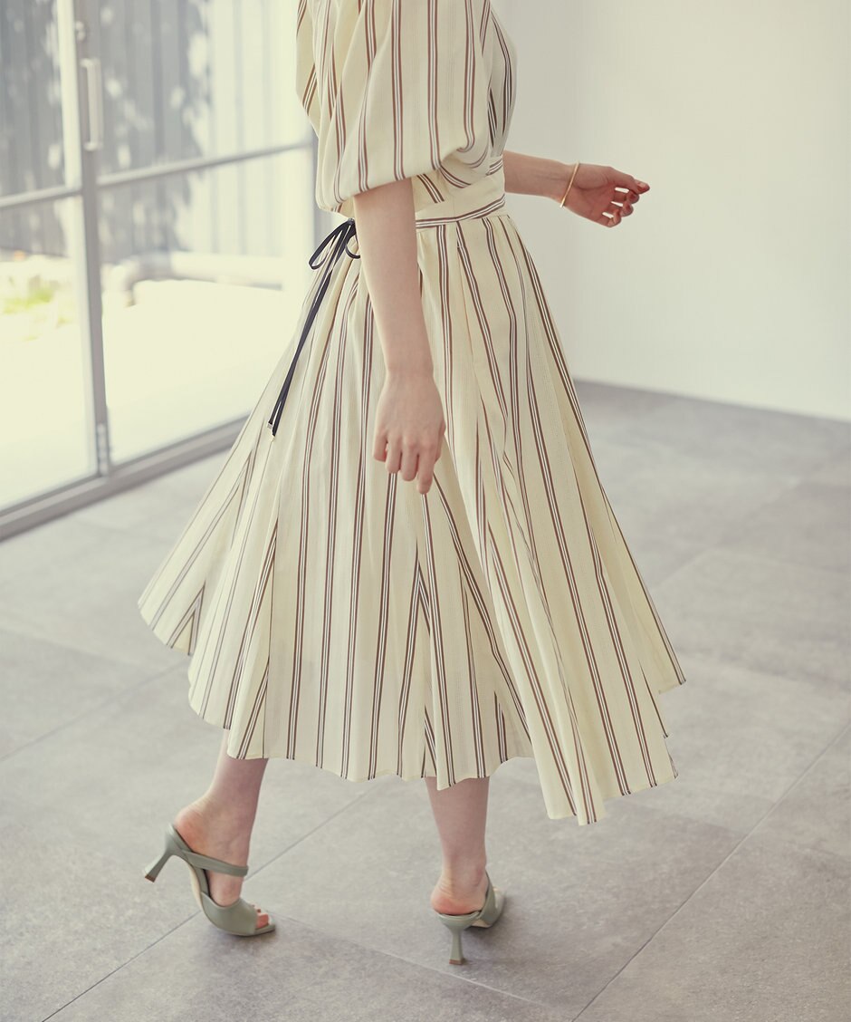 裾にかけてフレアを出したスカートシルエットがレディな雰囲気。ウエストの高めの位置に施した、シャーリングデザインがアクセントになり、スタイルアップ効果も期待できます。