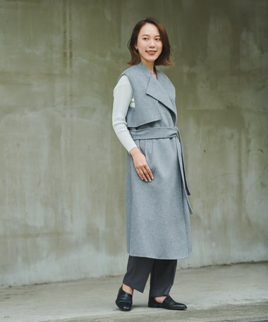 肉感のあるニットはジレと同色を選んで、着膨れを回避!