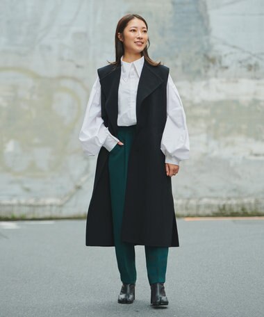 ロングジレにはボリュームスリーブブラウスを合わせた新鮮なスタイル。