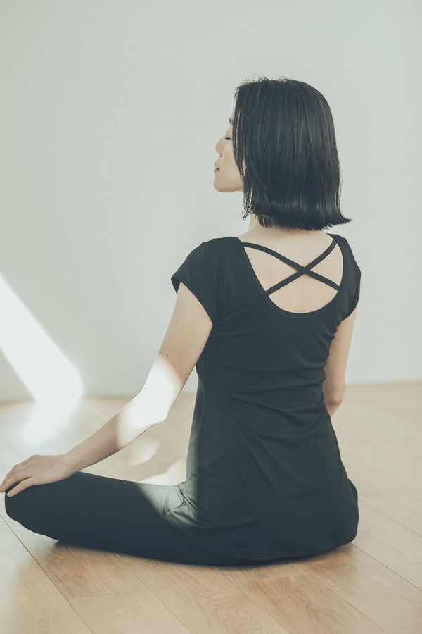 「ヨガウェアも普段の服も黒ばかり。白もたまに着ます」と話す彼女にその理由を尋ねると、「なんででしょうね(笑)」とはにかんだ表情を見せる。明確な理由はないそうだが、ゆっくりと言葉を選んで口にする穏やかな姿勢から、日々まとうものの選択も、ニュートラルな自分を保つ手立てのひとつになっているのではないかと想像させられる。