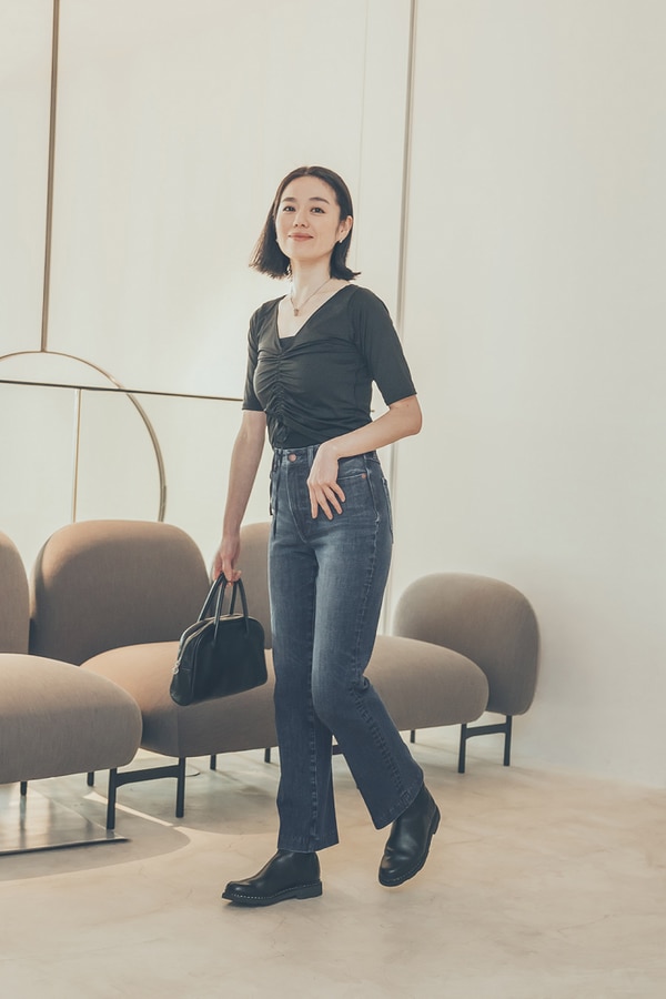 「最近デニムをあまりはいていなかったのですが、窮屈感のないはき心地が今の自分にフィットしている感じがしました。ギャザーが女性らしい印象になるTシャツも、黒ならわたしらしく着られます」