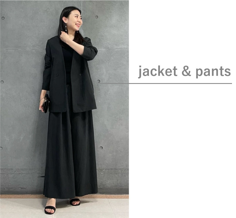 ジャケット×パンツのセットアップスタイル。