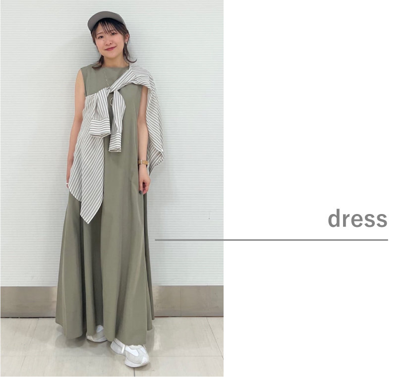 オリーブカラーのワンピースに、同系色のストライプシャツを合わせてアクセントに。