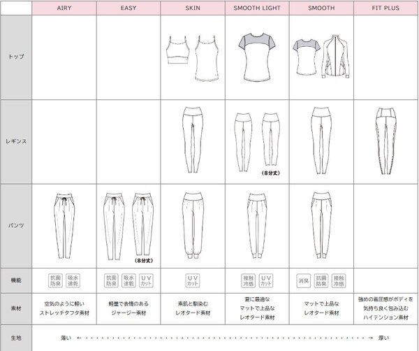 大野:最初に発売したのは、「SMOOTH(スムース)」「SKIN(スキン)」「EASY(イージー)」と「FIT PLUS(フィットプラス)」の前身にあたる「FIT(フィット)」の4種類です。開発にあたり、ベーシックラインとして、まずはお客さまのニーズが多様化しているレギンスを起点に、揃えるべきラインナップを考えていきました。強めの着圧でレッグラインを美しく見せる「フィット」に対し、締め付け感がなく素肌感覚ではける「スキン」、ストレッチ性があり、初めてレギンスをはく方でも気持ちよく動ける「スムース」の3種類があれば、多くのニーズにお応えできると思いました。
