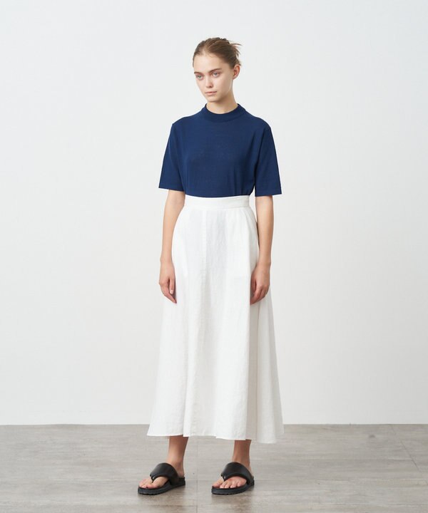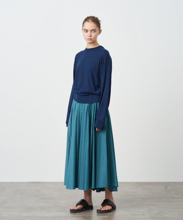 【RECYCLED FRESCA COTTON】: 富山県での紡績過程で生まれる落ちワタを再利用し、新潟県見附市で編み立てたニット製品です。30%のリサイクルワタに、70%のヴァージンの長綿を混ぜる事により、糸にムラ感と艶感生まれます。更に強撚糸にする事により、独特のシャリ感とドレープ感、肌離れ感も追加された、ATONオリジナルの素材です。