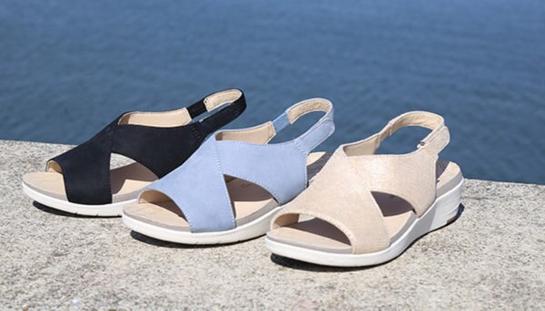 自然な足裏形状のフットベットと安定感のあるウエッジソールで安心の履き心地です。