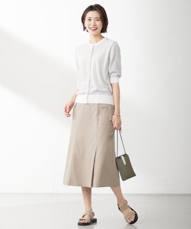 細かなタックが涼しげな、ひじが隠れる5分袖のボーダー柄カーディガン。アームホールにややゆとりを持たせているため、フレンチスリーブなど袖デザインがあるトップスにも羽織りやすいサイズ感です。細かな点を繋いで表現したボーダー柄は繊細な印象で、カジュアル過ぎず大人なデザインに仕上げています。