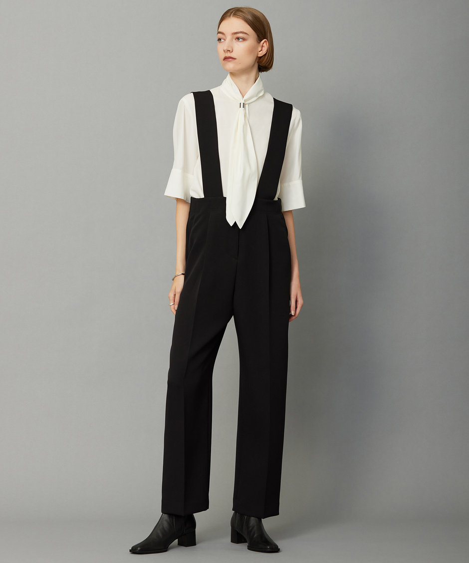 大人なきれいめオールインワンに、ボウタイブラウスで華やかさをプラス