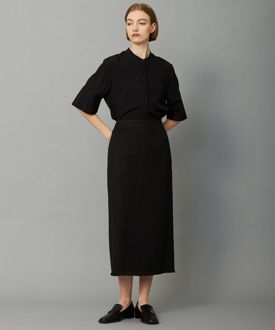 ツイード素材のスカートで、オールブラックコーデに奥行きを