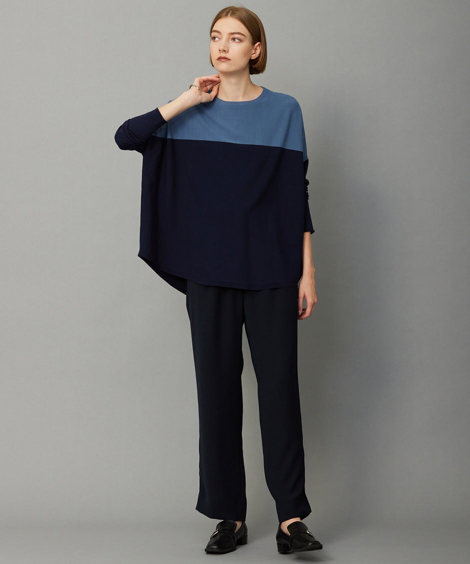 一枚で着映える異素材コンビトップスは、ダルブルーカラーを選んで秋仕様に