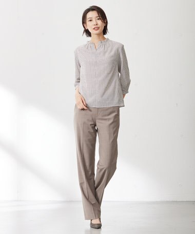 女性らしい華やかなチュニック丈のバンドカラーブラウス。前身頃の肩部分に入れた繊細なピンタックが、周りと差のつくポイント。抜け感のあるシルエットでヒップ周りをカバーでき、ゆったりと快適に着ていただけます。ウエスト部分にゴムシャーリングでギャザーを入れて表情を出した、デザイン性のあるアイテムです。袖丈は着回しやすい7分袖で、1枚で秋らしいコーディネートが完成します。